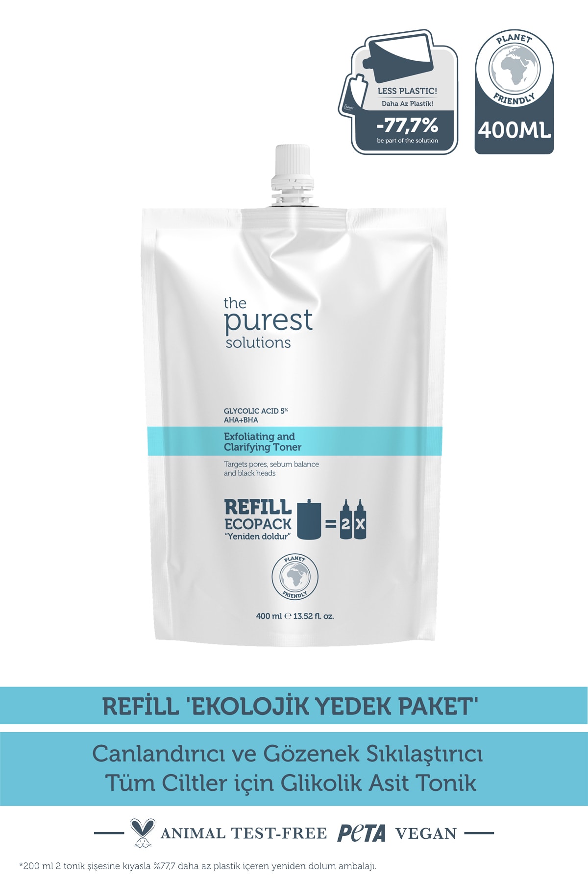 How to UseAfter cleaning your The Purest Solutions Glycolic Acid Tonic bottle, which has run out of product content, you can fill it with the ecological replacement package option. Our ecological packages are 400 ml and are designed to fill the package twice. We recommend that you keep your ecological spare package products at room temperature.After skin cleansing, apply a sufficient amount of the product to your skin with cotton or your hand as part of your night routine. Avoid contact with eyes. It is recommended to store it in a place not exposed to direct sun. It does not require rinsing after application.