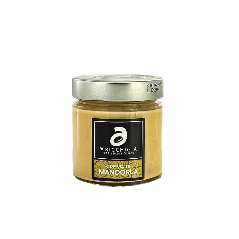Ricchigia's Sicilian almond cream is produced with respect for nature, selecting only the best raw materials to guarantee maximum freshness and quality of the final product. INGREDIENTS 30 almonds, sugar, vegetable oils and fats (sunflower oil, coconut oil, cocoa butter), skimmed milk powder, whey powder, emulsifier: sunflower lecithin, natural vanilla aroma.Smeerpasta met Siciliaanse Amandelen – 190g De Siciliaanse amandelcrème van Ricchigia wordt geproduceerd met respect voor de natuur, waarbij uitsluitend de beste grondstoffen worden geselecteerd om maximale versheid en kwaliteit van het eindproduct te garanderen. INGREDIËNTEN 30 amandelen, suiker, plantaardige oliën en vetten (zonnebloemolie, kokosolie, cacaoboter), magere melkpoeder, weipoeder, emulgator: zonnebloemlecithine, natuurlijk vanille-aroma.
