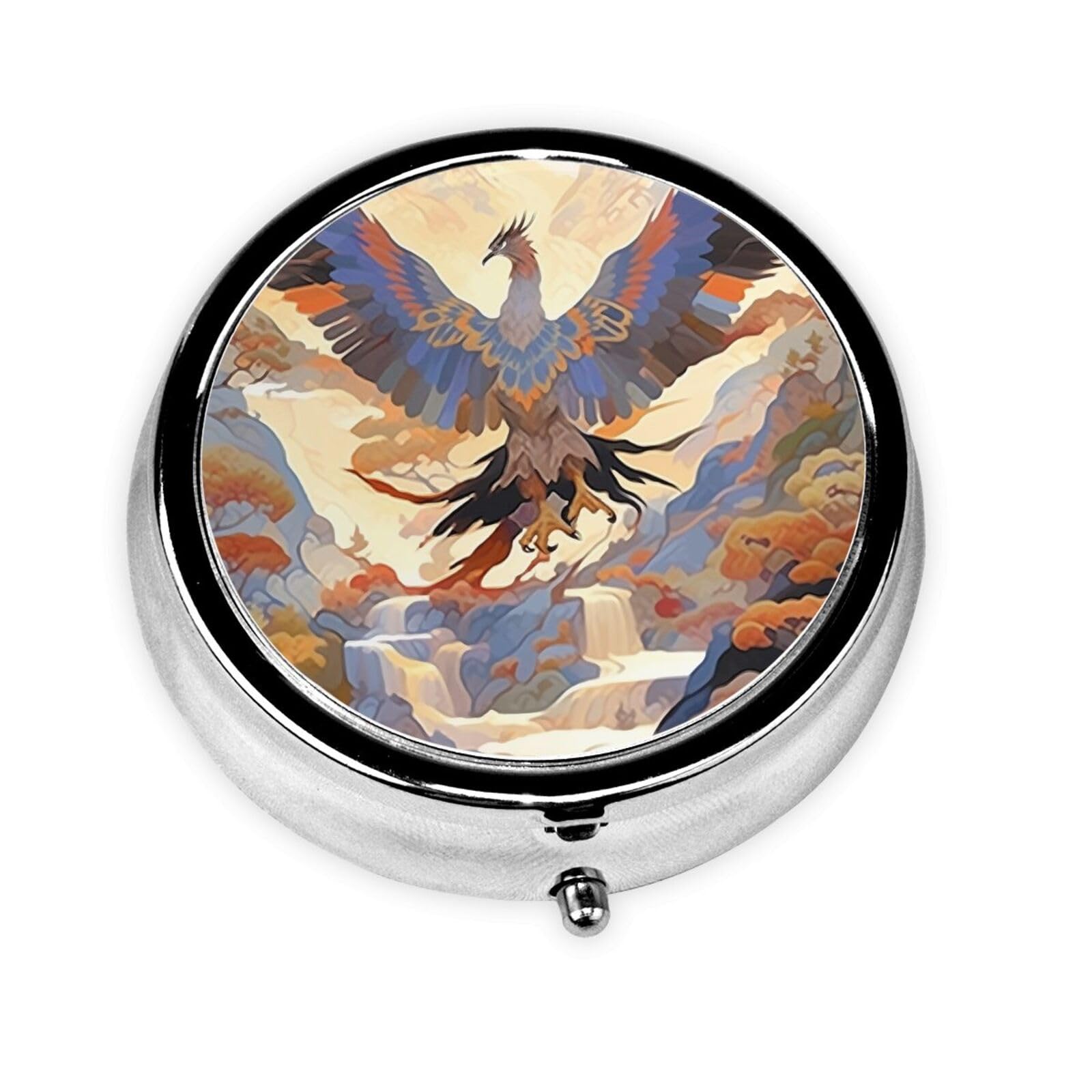 Wide range of applicable scenarios: suitable for use in various occasions such as home, office, and travel, providing you with convenient drug storage solutions. Multi-grid plastic inserts: The medicine box is designed with 3 plastic inserts inside, which can separate and store different types of pills, making them more organized and convenient to use. Convenient opening button design: The medicine box button design is easy to open, convenient and fast, and simple to operate, allowing you to easily access the medicine. Environmentally friendly metal material: Made of environmentally friendly metal iron plating material, it is durable, safe and reliable, and protects medicines from damage. The Roc with Wings Portable mini design: round mini pill box, measuring 2.0x2.0x0.7 inches, lightweight and portable, suitable for carrying in pockets and purses, providing you with urgently needed medicines anytime and anywhere.