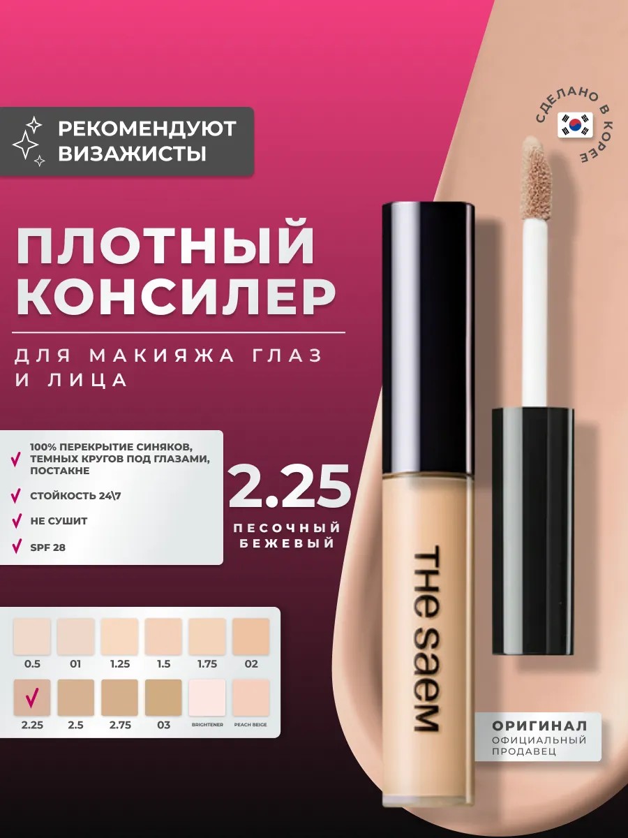 Жидкий плотный консилер для лица и глаз Корея The Saem Cover Perfection Tip Concealer SPF 28 Sand оттенка 2,25 песочного. Идеально ровная чистая кожа без недостатков - реальность вместе с этим консилером! Плотный консилер хорошо растушевывается, идеально ложится на кожу, скрывая ее недостатки. Корректор защищает кожу от УФ-лучей благодаря солнцезащитному фактору SPF28/РА++. Выпускается в нескольких цветовых вариантах, каждый из которых легко подстроится под тон Вашей кожи. Использование: после ББ крема. Нанесите небольшое количество кансилера на проблемные участки кожи и равномерно распределите кончиками пальцев или спонжиком. Корректор для глаз, контуринг лица, консилер под глаза, корректор, декоративная косметика. Идеален в перекрытии маскировки синяков под глазами и морщинок. Формат флакона удобен в дороге с собой. Занимает мало места и экономичен в расходе благодаря кисточке для нанесения. Подходит для сухой, жирной кожи, для девочек и женщин. Продукт сделает вашу кожу ухоженной, гладкой и шелковистой. Состав направлен уход за кожей, а не просто скрытие недостатков. Жидкий, кремовый тон водостойкий прекрасно подойдёт для летней жары, и не смоется с кожи от пота, в неподходящий момент. Маскировка естественная. Товар можно приобрести в подарок, ведь это средство необходимое каждой. Данная палитра включает в себя теплые оттенки для более теных и смуглых девушек. Теплый бежевый и темный бежевый оттенки, персиковые - помогут подчеркнуть ваш оттенок кожи и не выбеливать его светлыми оттенками!