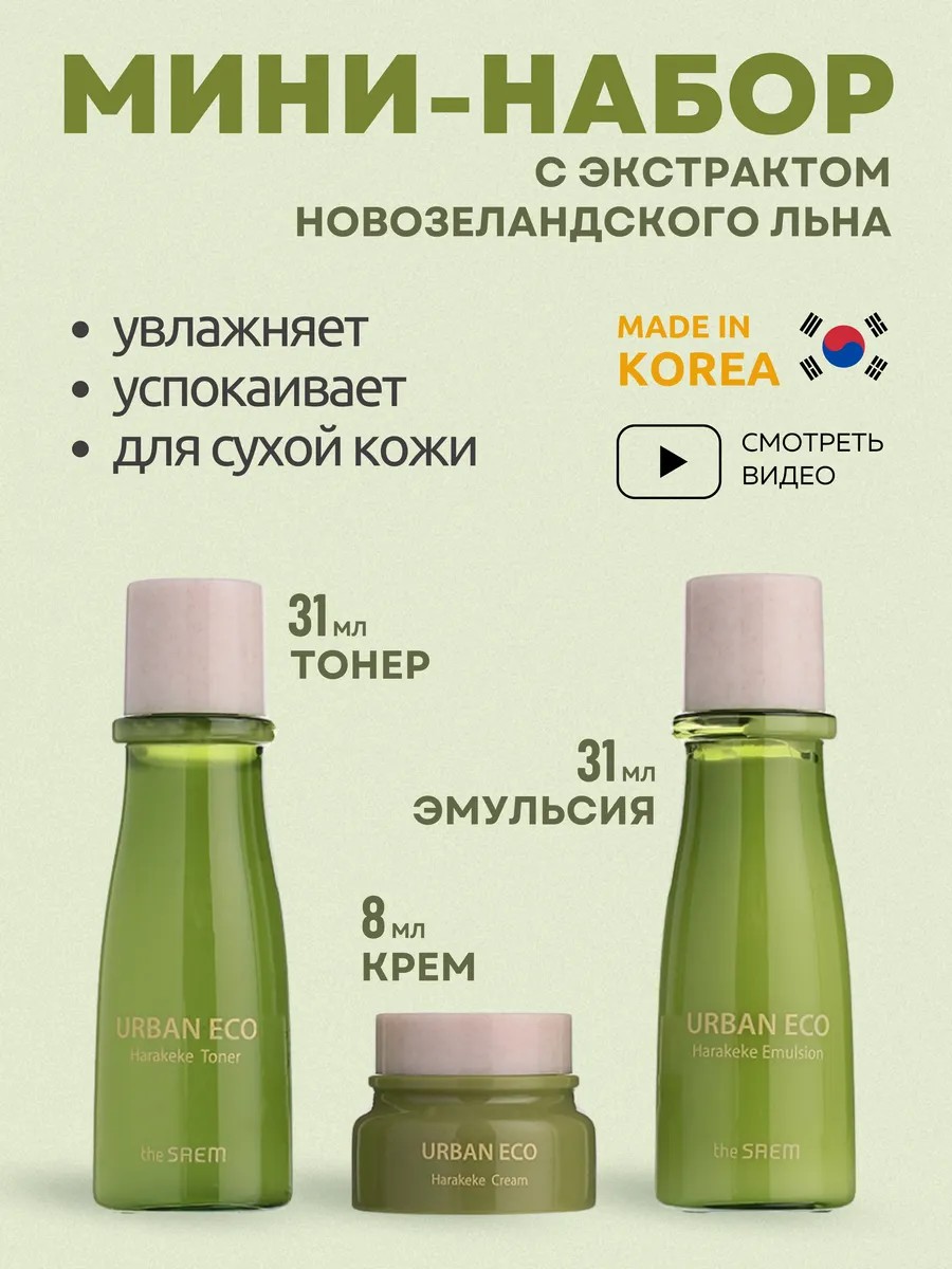Дорожный бьюти набор корейской косметики для ухода за лицом с экстрактом новозеландского льна, увлажняющий, питающий, смягчающий и успокаивающий кожу. Тревел набор пробников-миниатюр для путешествий в коробке, которую можно использовать в качестве подарка для женщин и мужчин, девушке, маме, подруге и бабушке. В комплекте Urban Eco Harakeke Mini 3 Set: Тонер для лица - 31 мл; Эмульсия - 31 мл; Крем - 8 мл.