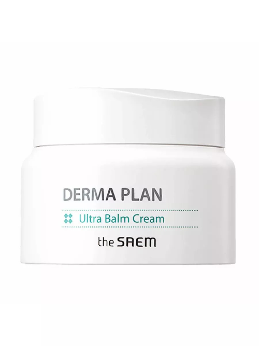 The Saem Derma Plan Ultra Balm Cream, a hypoallergenic cream-balm for sensitive skin, contains a green complex of 7 plants with soothing properties, as well as panthenol, ceramides, and shea butter.