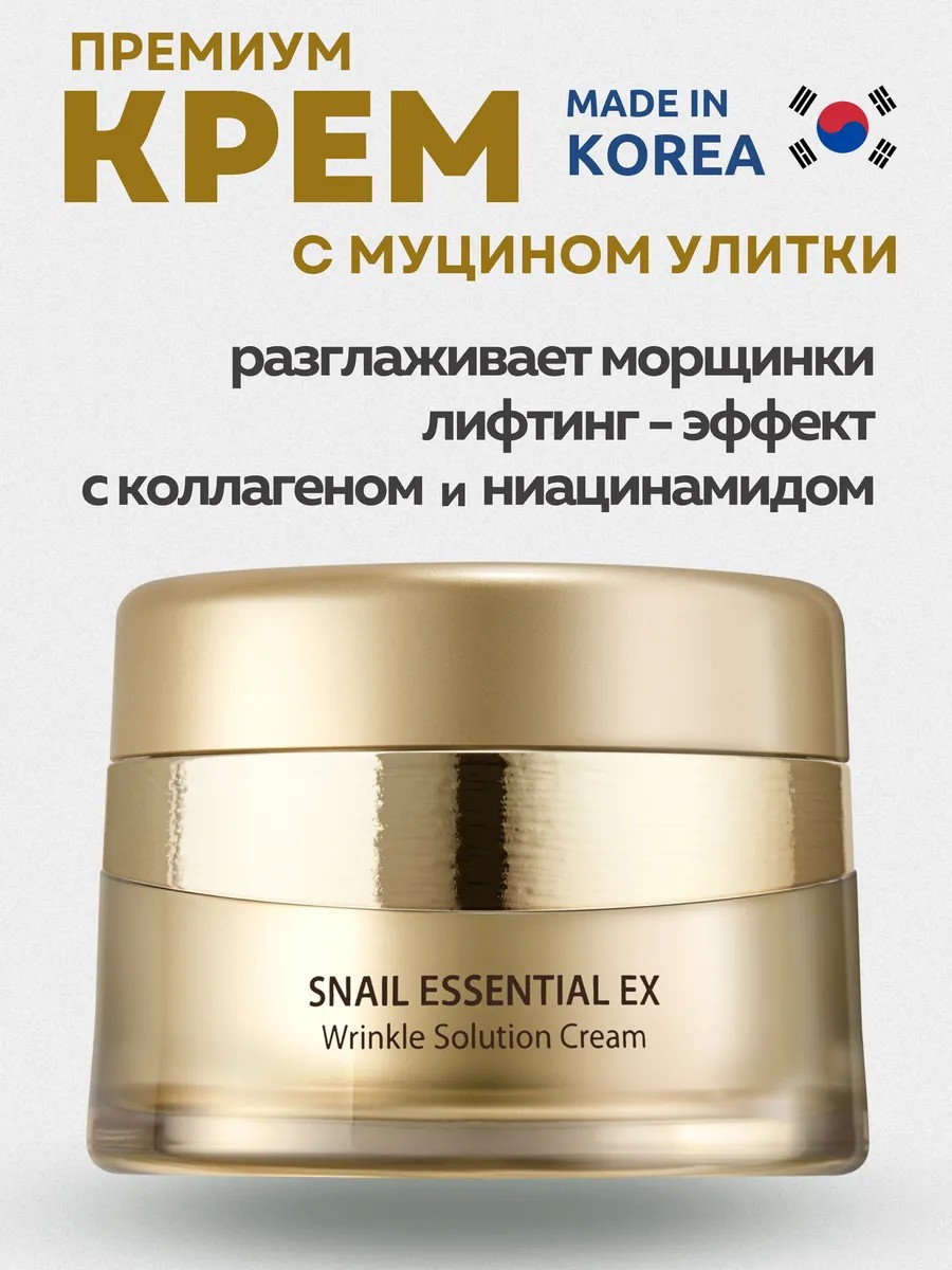 Hydrolyzed collagen helps establish optimal hydrobalance, provides tightening for aging skin 35 and 30+, light hypoallergenic Snail Essential Ex Wrinkle Solution Cream 40+ and 45+ is produced by the famous brand The Saem.