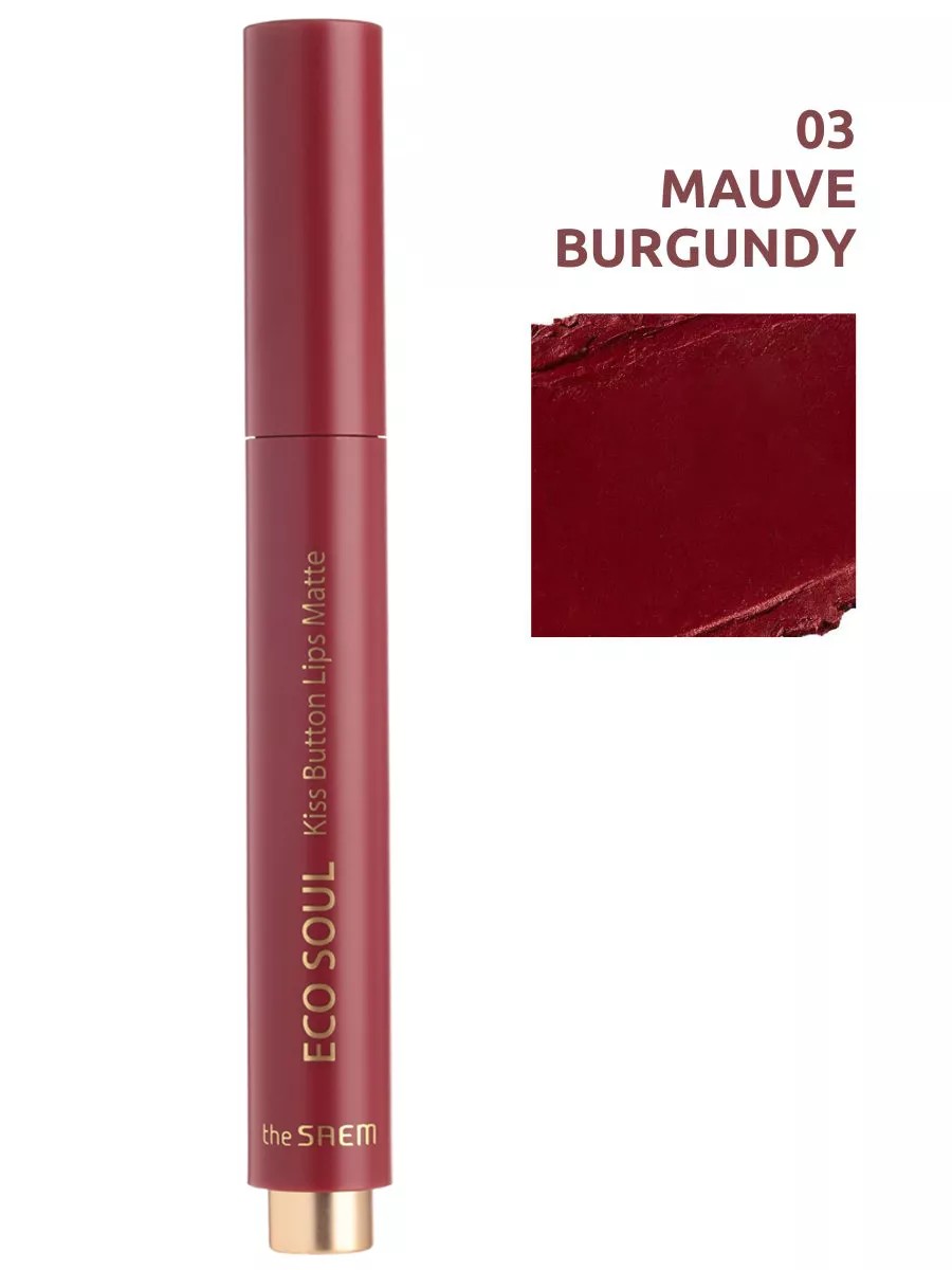 Матовая помада для губ легко ложится на кожу губ, не подчеркивая шелушения и не вызывая ощущение сухости кожи губ. Средство 3 в1: нежное, как бальзам, придает естественность губам, как тинт, богатый и насыщенный цвет, как помада. Легкие и мягкие оттенки обеспечивают ощущение комфорта даже при многократном нанесении. Оригинальная форма в виде автоматического карандаша. Способ применения: нанесите помаду тонким слоем на кожу губ. Для более насыщенного цвета нанесите повторно. // The Saem Eco Soul Kiss Button Lips Matte 03 Mauve Burgundy