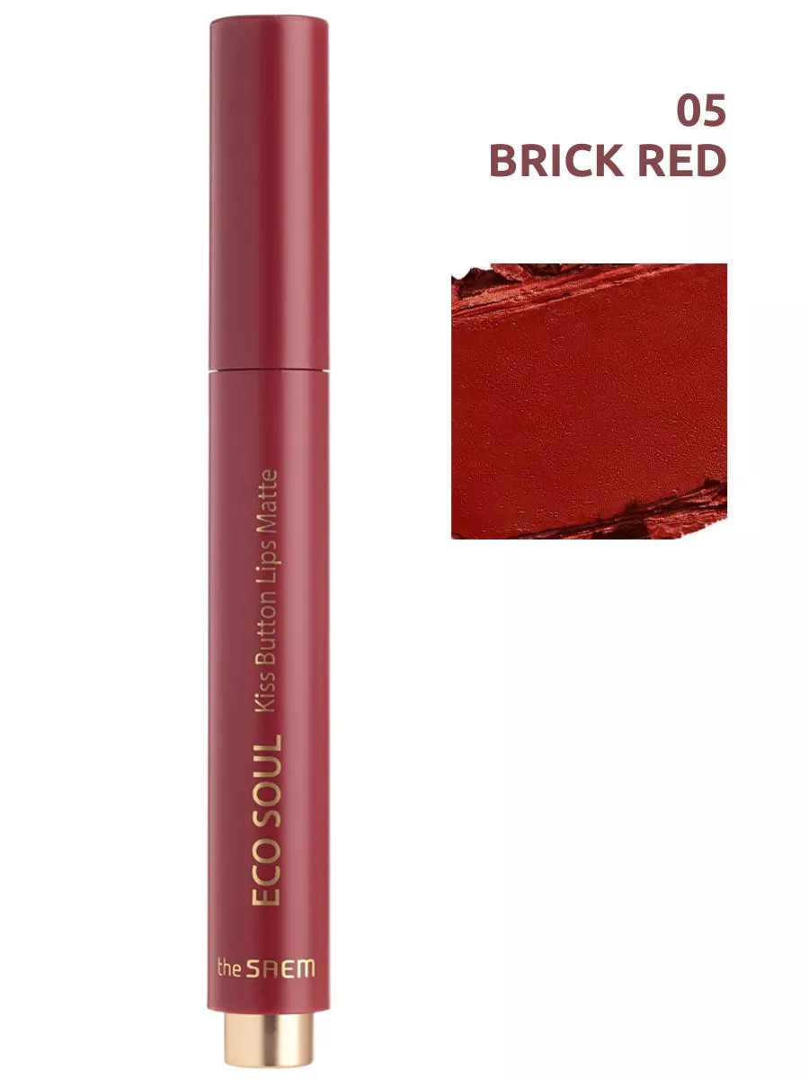 Матовая помада для губ легко ложится на кожу губ, не подчеркивая шелушения и не вызывая ощущение сухости кожи губ. Средство 3 в1: нежное, как бальзам, придает естественность губам, как тинт, богатый и насыщенный цвет, как помада. Легкие и мягкие оттенки обеспечивают ощущение комфорта даже при многократном нанесении. Оригинальная форма в виде автоматического карандаша. Способ применения: нанесите помаду тонким слоем на кожу губ. Для более насыщенного цвета нанесите повторно. // The Saem Eco Soul Kiss Button Lips Matte 05 Brick Red