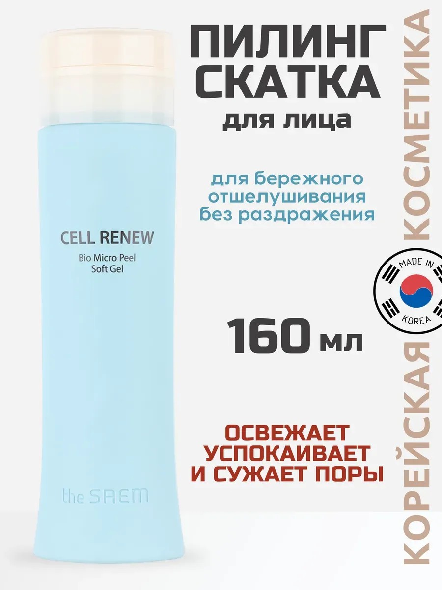 The Saem Cell Renew Bio Micro Peel Soft Gel Пилинг-скатка для лица, 160 мл // Мягкое, не травмирующее кожные покровы, очищение - пилинг-скатка от The Saem, из линии косметических средств Cell Renew Bio, помогает вернуть свежий, сияющий и здоровый вид кожи. Серия средств этой линии способствует обновлению и восстановлению клеток кожи, стимулируют синтез собственного коллагена и эластина, что положительно сказывается на внешнем виде кожи - она заметно подтягивается, становится эластичной и упругой, увлажненной, без шелушений и покраснений.Пилинг начинает действовать при контакте с кожей, образуя "катышки", которые обеспечивают легкий массаж. После использования пилинга кожа становится ровнее, очищенные поры сужаются, тусклый цвет и шелушения кожи исчезают. Лицо сияет чистотой и свежестью.