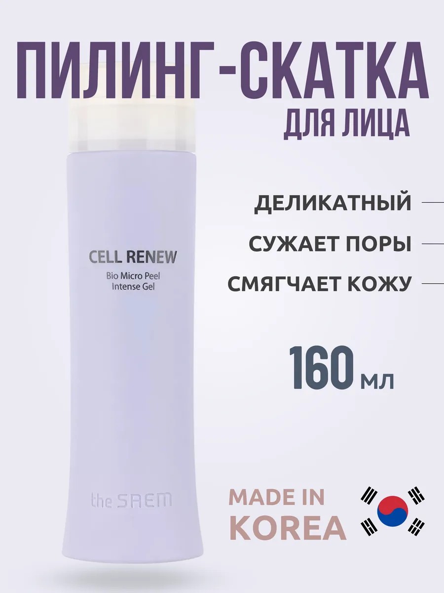 The Saem Cell Renew Bio Micro Peel Intense Gel Интенсивный пилинг-гель с растительными стволовыми клетками, 160 мл // Усиленная версия популярного пилинга Cell Renew Bio Micro Peel Soft от The Saem. "Умная" система отшелушивания отмерших клеток и удаления загрязнений Smart Targeting Peeling System помогает сделать кожу еще более чистой, более гладкой, не вызывая при этом раздрражений.Как и все средства серии Cell Renew Bio, пилинг , благодаря чему кожа заметно преображается.Стволовые клетки растений - особая ткань из почек и ростков растений, в которой содержатся инициальные клетки, обладающие уникальным свойством восстанавливать ткани кожи. Стволовые клетки активно противостоят старению, очищают и восстанавливают клетки после перенесенных стрессов, улучшают клеточный метаболизм, поддерживают уменьшающуюся с возрастом выработку коллагена и эластина.**Способ применения:** Нанести средство на сухую очищенную кожу лица аккуратными массирующими движениями до появления "катышков", затем умыть лицо теплой водой. Применять 1-2 раза в неделю.