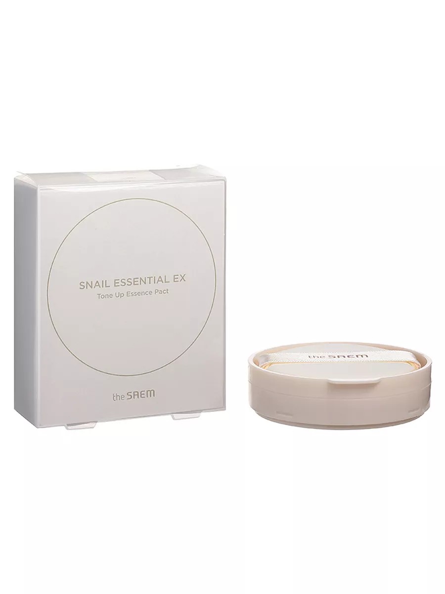 SM Snail Essential EX Tone Up Essence Pact Refill Powder. This product simultaneously adds radiance, brightens, and hydrates skin, while also protecting against UV rays. Thanks to the combination of two shades (white and soft pink), this product brightens dull skin, creating a clear and even tone. Contains snail mucin and gold. How to use: Apply the product with gentle pressing movements using a sponge.