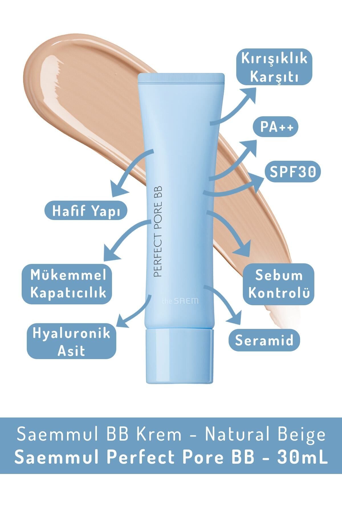 Cildi yatistirmak ve nemlendirmek için içeriginde dogal bitki özleri bulunur. Ayni zamanda cildi sikilastirmak ve korumak için seramid kompleksi içerir. Cildin nem dengesini korur. Hafif ve dogal bir bitis saglar. Hint Lotusu Çiçegi Suyu (Nelumbo Nucifera Flower Water) ile ciltte yatistirici bakim saglar.SPF30 PAkorumasi ile günesin zararli isinlarina karsi da koruma saglar. Iç ve dis mekanlarda rahatlikla kullanilabilir. Uzun süreli kalici formülü sayesinde etkisini tüm gün korur. The Saem Saemmul Perfect Pore BB Cream sayesinde gözenekleri pürüzsüzlestirmek ve cilt tonunu esitlemek isteyenler için etkili bir üründür.