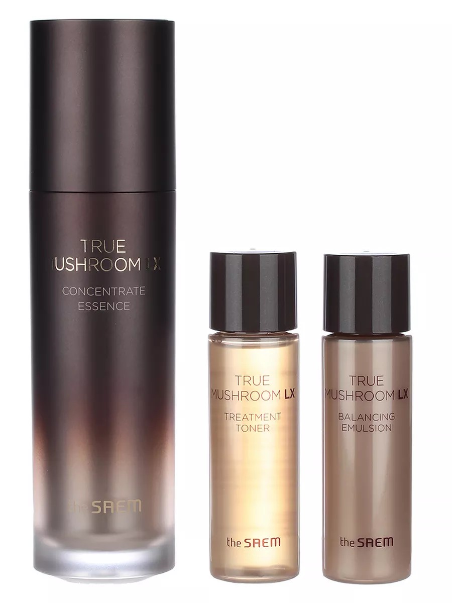 СМ MUSHROOM Набор уходовый антивозрастной TRUE MUSHROOM LX Concentrate Essence Special Set (тонер, эссенция, эмульсия) . Набор средств содержит грибной комплекс, который сочетает в себе 5 видов грибов и ферментированных ингредиентов, экстрагированных в течение 100 часов. В наборе: тонер, эссенция, эмульсия. Тонер для лица быстро впитывается, кожа становится гладкой и сияющей. Укрепляющая эссенция для лица, которая одновременно разглаживает морщины и повышает эластичность кожи. Питательная эмульсия с грибным комплексом глубоко увлажняет и питает кожу, делает ее более упругой и гладкой. Способ применения: на очищенную кожу нанести тонер, эссенцию, эмульсию.
