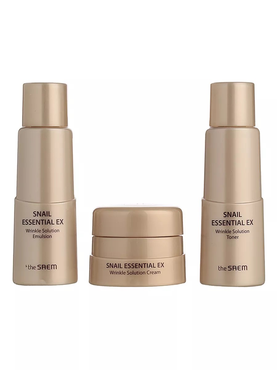 SM Snail Essential Cream Set (Sample) Snail Essential EX Wrinkle Solution Special Gift 3 Set. The anti-aging Snail Essential EX Wrinkle Solution Skin Care 3 Set contains key products for comfortable and effective care, even for ultra-sensitive skin, thanks to snail extract. The anti-aging toner significantly improves skin texture. The non-greasy cream consolidates the complex effect of the products, accelerating tissue healing and helping to reduce the number and depth of wrinkles. How to use: Cleanse skin and wipe it with toner, then apply essence and cream.