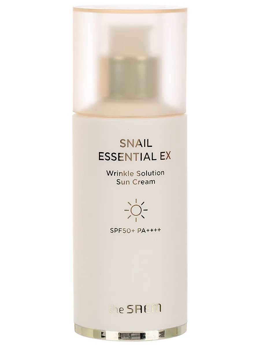 The Saem Snail Essential Ex Wrinkle Solution Sun Cream SPF 50+ PA++++ Sunscreen, 40 ml // Offers reliable skin protection from UV radiation, as well as excellent care. The optimal combination of components in the cream allows you to not only prevent sunburn, but also significantly improve the condition of the skin, and slow down the aging process. High sun protection factor SPF 50+ PA+++ **helps protect the skin even at the time of maximum sun activity**, prevent the appearance of redness, burns, pigmentation. In addition, the cream works in several other ways: **moisturizes and soothes the skin, restores it, lightens pigmentation and improves elasticity**. By purchasing this cream, you get not only a reliable sunblock, but also a complete moisturizing, restorative, rejuvenating cream. **The cream is hypoallergenic, suitable even for sensitive skin.**