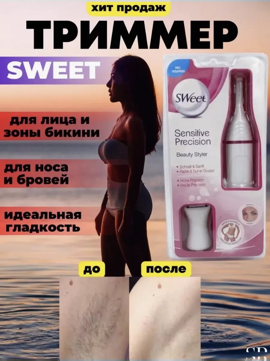 | Комплектация | Триммер Sweet RTM Электрический Триммер женский; триммер для чувствительных участков тела; триммер женский; 3 сменные насадки; щеточка для чистки; колпачок; товары для красоты; здоровье |