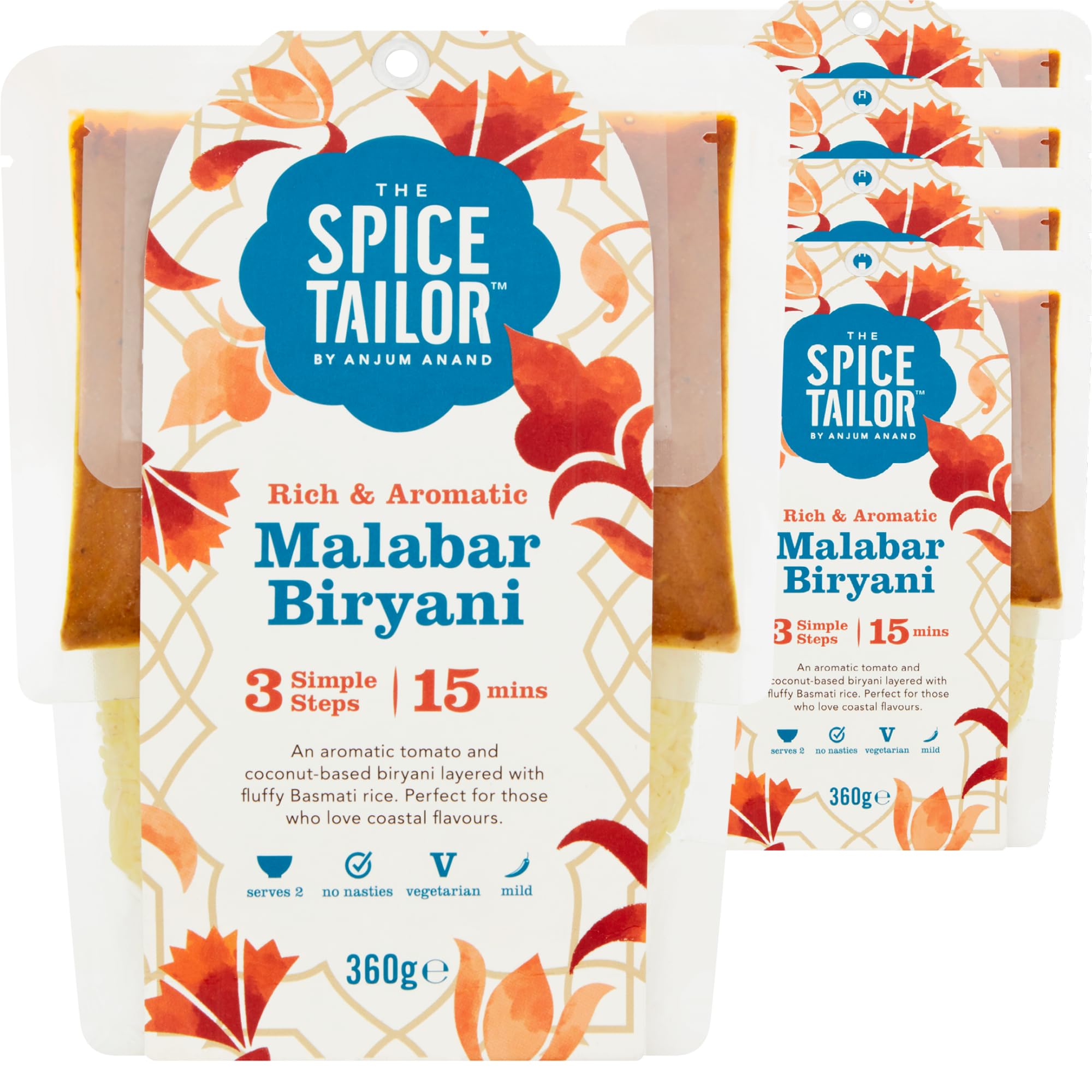 Inspired by the coastal flavors of the Malabar region and traced back to dishes created by Muslim and Arab traders who settled here, this Biryani is mild in heat, yet aromatic and complex in taste. Favorite local spices are intertwined with rich tomatoes and tempered with white poppy seeds and coconut. This dish is really something special. An exciting and tasty dish that may seem new, but will soon be loved by everyone. Our Biryanis contains three sachets - a seasoned and cooked Basmati rice, a cooking sauce and dried whole spices. These handy kits are easy to use and take just 15 minutes to prepare. Just saute the spices, add your proteins or veggies and reduce the sauce and, once cooked, top with the rice and steam on the stovetop. INGREDIENTS Cooked Rice (67 ), Water, Sunflower Oil, Tomato Puree (3 ), Coconut Milk Powder (3 ), Whole and Ground Spices, Salt, Dried Onion, Ginger, Poppy Seeds (1 ), Fennel Seeds, Garlic, Green Chili, Whole MILK Powder SAFETY WARNING No See moreThe Spice Tailor, Biryani Kits, Malabar Biryani in 15 minuten met 3 eenvoudige stappen, 360 g pakket (Pack van 5) Geïnspireerd door de kustsmaken van de Malabar-regio en terug te voeren op gerechten gemaakt door islamitische en Arabische handelaren die zich hier vestigden, is deze Biryani mild van hitte, maar aromatisch en complx van smaak. Favoriete lokale kruiden zijn verweven met rijke tomaten en getemperd met witte maanzaad en kokosnoot. Dit gerecht is echt iets bijzonders. Een spannend en smaakvol gerecht dat misschien nieuw lijkt, maar al snel bij iedereen geliefd is. Onze Biryanis bevat drie zakjes - een gekruide en gekookte Basmati rijst, een kooksaus en gedroogde hele kruiden. Deze handige kits zijn gemakkelijk te gebruiken en nemen slechts 15 minuten in beslag om te bereiden. Bak gewoon de kruiden, voeg je eiwitten of groenten toe en kook de saus in en, eenmaal gekookt, bedek met de rijst en stoom op de kookplaat. INGREDIËNTEN Gekookte Rijst (67 ), Water, Zonnebloemolie, Tomatenpuree (3 ), Kokosmelkpoeder (3 ), Hele en gemalen kruiden, Zout, Gedroogde Ui, Gember, Maanzaad (1 ), Venkelzaad, Knoflook, Groene Chili, Volle MELKpoeder VEILIGHEIDSWAARSCHUWING Nee Meer bekijken