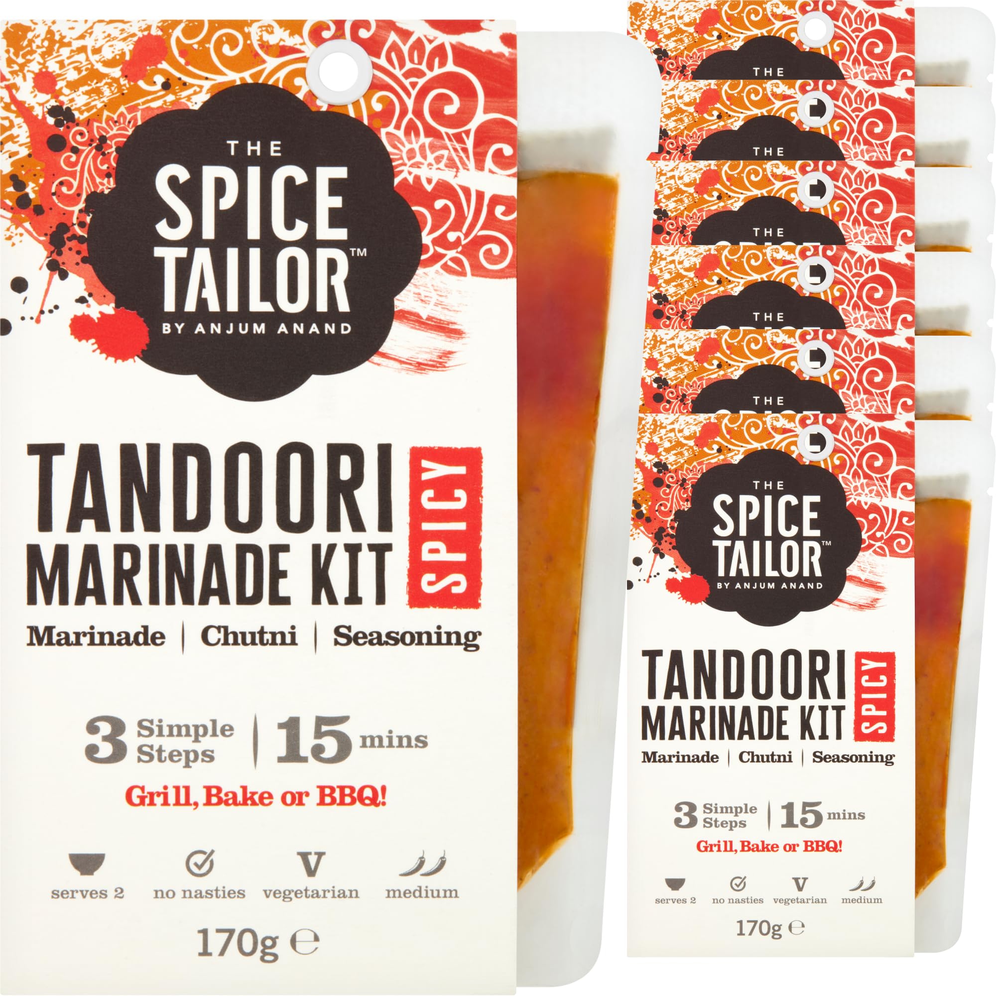 Tandoori food refers to grilled or roasted skewers of meat and vegetables cooked in a tandoor oven over charcoal. The flavors are reminiscent of a BBQ char, but with savory and spicy Indian flavors. If you're already a tandoori fan and love heat, our Spicy Tandoori Marinade Kit is sure to be your new best friend! The marinade evokes that delicious tandoori restaurant flavor, full of yogurt tang, ginger, garlic, heat and spice. For Indian chefs, tandoori food takes a lot of training to master. But with ovens and grills at hand—and now Tandoori Marinade Kits—you can achieve that sought-after, mouthwatering marriage of spiced yogurt coating and chary smokiness in minutes. We like to use these boxes to add pockets of flavor to meat and vegetables in the oven in the winter - and to add an Indian twist to classic BBQ dishes in the summer. INGREDIENTS Water, Cream (MILK), Ginger, Spices (Coriander, Mint), Tomato Puree, MILK Powder, Sunflower Oil, Garlic, Spice Powder, Salt, Sugar, Lime Juice, Tamarind Paste, Chili Powder, Gram Flour, Paprika Powder, Black Pepper, Cumin Powder, Green Chili, Spice Sachet: Spices, Salt, Rice Flour, Anti-Com aking Agent (Silicon on Dioxide) INSTRUCTIONS FOR USE Serves 2-3 1. Heat 1 teaspoon oil in a small pan, add spices and cook for 20 seconds. 2. Add the meat, brown lightly for 2-3 minutes, add the base sauce and simmer for 2 minutes. 3. Stir in the main sauce and simmer for 3-5 minutes or until the meat is cooked through (1- 1 1 4 hours for shoulder and leg and 30-35 minutes for mince) SAFETY WARNING No See moreThe Spice Tailor, Marinade Kits, Spicy Tandoori Marinade Kit, 170 g Pakket (Pack van 7) Tandoori-voedsel verwijst naar gegrilde of geroosterde spiesjes van vlees en groenten gekookt in een tandooroven op houtskool. De smaken doen denken aan een BBQ char, maar dan met hartige en kruidige Indiase smaken. Als je al een tandoori-fan bent en van warmte houdt, is onze Spicy Tandoori Marinade Kit zeker je nieuwe beste vriend! De marinade roept die heerlijke tandoori-smaak van het restaurant op, vol yoghurttang, gember, knoflook, warmte en kruiden. Voor Indiase chef-koks vergt tandoori-eten veel training om onder de knie te krijgen. Maar met ovens en grills bij de hand - en nu ook Tandoori Marinade Kits - kun je dat gewilde, overheerlijke huwelijk bereiken met gekruide yoghurtcoating en chary rokerigheid in minuten. We gebruiken deze kisten graag om smaakzakken toe te voegen aan vlees en groenten in de oven in de winter - en om in de zomer een Indiase twist toe te voegen aan klassieke BBQ-gerechten. INGREDIËNTEN Water, room (MELK), Gember, Kruiden (Koriander, Munt), Tomatenpuree, MELKpoeder, Zonnebloemolie, Knoflook, Kruidenpoeder, Zout, Suiker, Limoensap, Tamarinde Pasta, Chilipoeder, Grammeel, Paprikapoeder, Zwarte peper, Komijnpoeder, Groene Chili, Kruidenzakje: Specerijen, Zout, Rijstmeel, Anti-Com aking Agent (Silicium op Dioxide) GEBRUIKSAANWIJZING Serveert 2-3 1. Verwarm 1 theelepel olie in een kleine pan, voeg kruiden toe en kook gedurende 20 seconden. 2. Voeg het vlees toe, bruin licht gedurende 2-3 minuten, voeg de basissaus toe en laat 2 minuten sudderen. 3. Roer de hoofdsaus erdoor en laat 3-5 minuten sudderen of tot het vlees gaar is (1- 1 1 4 uur voor schouder en been en 30-35 minuten voor gehakt) VEILIGHEIDSWAARSCHUWING Nee Meer bekijken