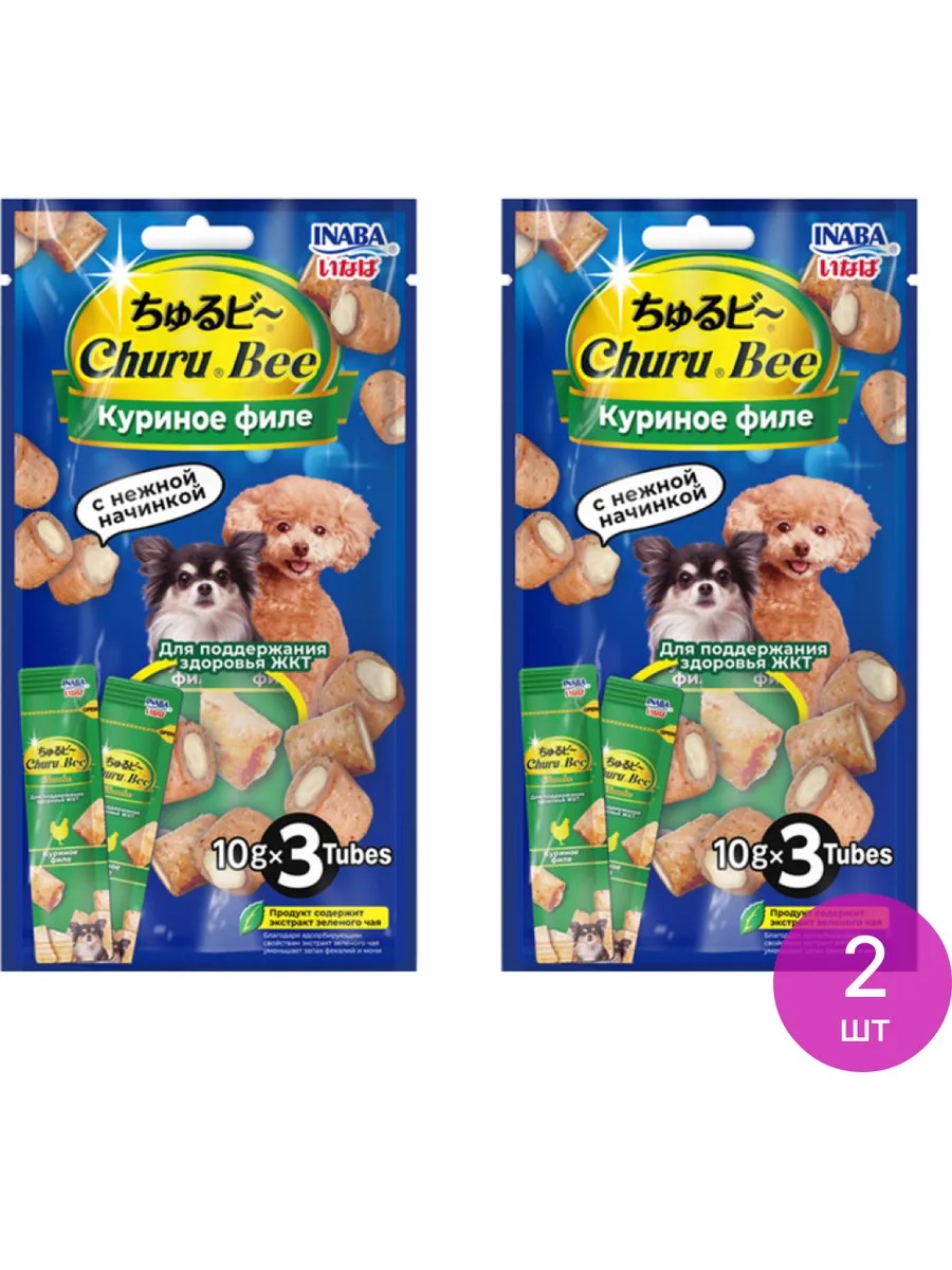 Лакомство для собак Inaba / Инаба Churu Bee для животных мелких пород для здоровья ЖКТ, трубочки с куриным филе, в упаковке 3шт. по 10г / вкусняшки.