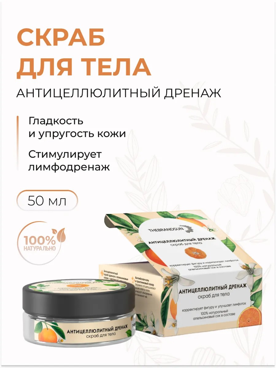 | Полное наименование товара | Скраб для тела антицеллюлитный дренаж с апельсиновым соком 150 мл, «TheBrandSUN» |