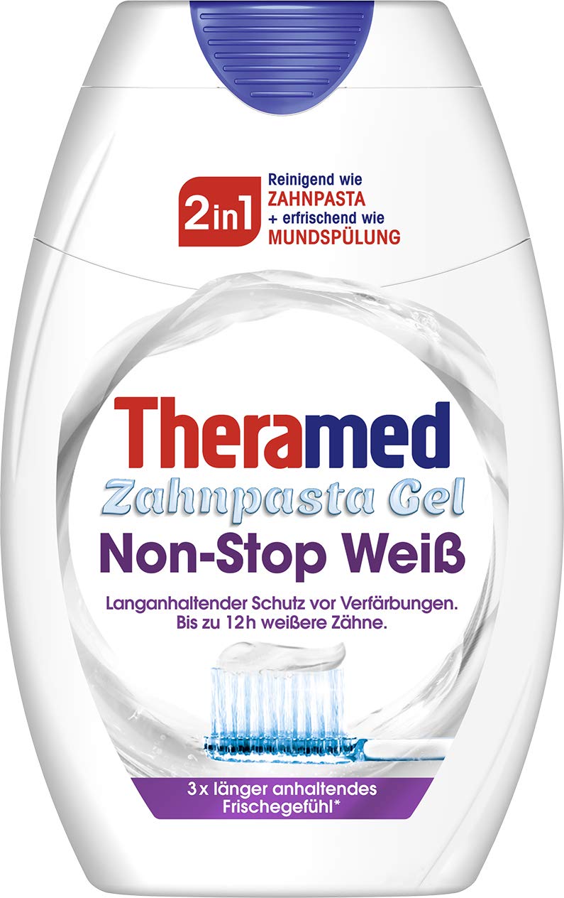 Theramed 2 in 1 Non-Stop White with effective protection against new discoloration – Up to 12 hours of whiter teeth. 3x longer lasting freshness compared to regular toothpaste. Complete protection for healthy teeth and gums. Antibacterial action for fresh breath. INGREDIENTS Sorbitol, Aqua, Hydrated Silica, Pentasodium Triphosphate, Glycerin, Sodium Lauryl Sulfate, Aroma, PVM MA Copolymer, PEG-32, Alcohol, Sodium Benzoate, PEG-30 Glycerin Stearate, Sodium Fluoride, Xanthan Gum, Sodium Hydroxide, Cocamidopropyl Betaine - Sodium Chloride - Sodium Sulfate - Limonene - CI 77891Long-lasting protection against discoloration. Up to 12 hours of whiter teeth. Toothpaste gel. 2 in 1: cleans like toothpaste and freshens like mouthwash. Theramed 2 en 1 Non-Stop Blanc avec protection efficace contre les nouvelles décolorations – Jusqu'à 12 h de dents plus blanches. Sensation de fraîcheur 3 fois plus durable par rapport à un dentifrice ordinaire. Protection complète pour des dents et des gencives saines. Action antibactérienne pour une haleine fraîche. INGRÉDIENTS Sorbitol, aqua, silice hydratée, pentasodium triphosphate, glycérine, lauryl sulfate de sodium, arôme, copolymère PVM MA, PEG-32, alcool, benzoate de sodium, stéarate de glycérine PEG-30, fluorure de sodium, gomme de xanthane, hydroxyde de sodium, cocarine. Camidopropyl Bee Taine - Chlorure de sodium - Sulfate de sodium - Limonène - CI 77891Protection longue durée contre la décoloration. Jusqu'à 12 h de dents plus blanches. Gel dentifrice. 2 en 1 : nettoie comme du dentifrice et rafraîchit comme un bain de bouche.