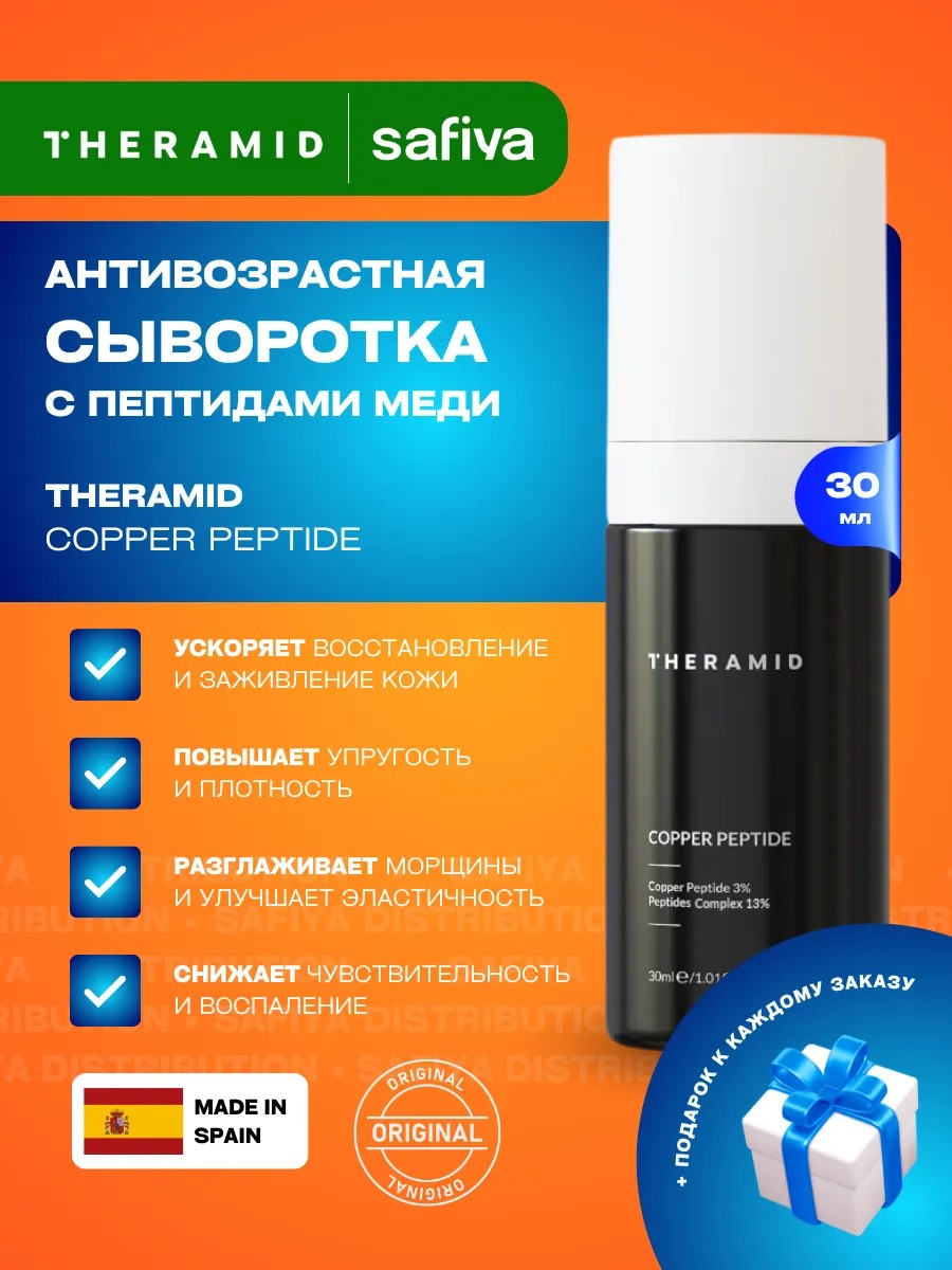 THERAMID Copper Peptide - сыворотка, содержащая пептид меди - редкий ингредиент, обладающий доказанным антивозрастным и восстанавливающим действием. Он ускоряет заживление, делает кожу плотнее, укрепляет сосуды и снижает чувствительность, не вызывая раздражения.