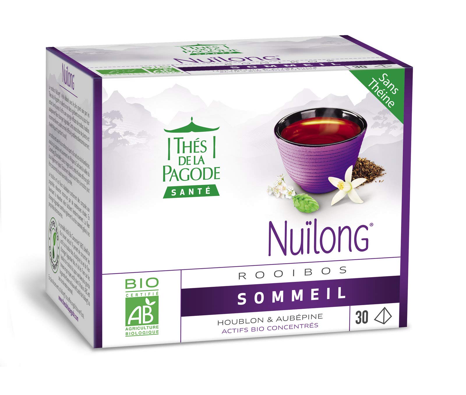 A subtly aromatic infusion to pamper you! Rooibos Nuïlong, in boxes of 30 bags, combines the soothing effect and the delicious, medicinal benefits of several precious plants to help you enjoy peaceful nights. Having trouble falling asleep and waking up frequently? Are you lacking sleep? Nature offers a simple and delicious remedy by combining South African rooibos, hops, hawthorn, and bitter orange blossom. A cocktail of benefits, caffeine-free Rooibos Nuïlong tea helps you relax and reduces the fear of finding restful nights. The rooibos in Rooibos Nuïlong is harvested from a bush in the acacia family, found only in the Cederberg Valley. It is prized in South Africa for its beautiful copper color and spicy taste. Caffeine-free, it quenches your thirst throughout the day. All these properties are enhanced by the addition of hops and hawthorn, known for their calming and relaxing effects, as well as Brigadier orange blossom, whose essential oil contains anti-stress properties. Thanks to TeaPlus's expertise, the active ingredients of the plant extracts are fixed directly onto the rooibos leaves. Rooibos Nuïlong therefore has 10 to 20 times more relaxing and soothing properties than a traditional herbal tea. Rooibos Nuïlong is packaged in transparent, pyramid-shaped pagoda bags that allow the rooibos leaves to fully release their aroma. It makes an original and refined gift for Christmas or a birthday. INSTRUCTIONS FOR USE Infuse 1 tea bag in 250 ml of hot water (approximately 100 C) for 3 to 5 minutes, then remove the bag and enjoy. Recommended before bedtime.Thes De LA Pagode Nuïlong Rooibos - Thé Dormir au Houblon et Aubépine - 30 sachetsDESCRIPTION DU PRODUIT DESCRIPTION DU PRODUIT Une infusion aux arômes subtils qui vous dorlotent ! Rooibos Nuïlong en boîtes de 30 sacs combine l'effet apaisant et les bienfaits savoureux et médicaux de plusieurs plantes précieuses pour vous aider à profiter de nuits paisibles. Des difficultés à vous endormir et à vous réveiller fréquemment, vous manquez le sommeil ? La nature offre un remède simple et délicieux en combinant rooibos d'Afrique du Sud, houblon, aubépine et fleurs d'oranger amères. Un cocktail d'avantages, le thé Rooibos nuïlong sans théin aide à se détendre et réduit la peur de trouver des nuits paisibles. Les Rooibos contenus dans le Rooibos Nuïlong sont cueillis dans un buisson de la famille d'acacia, qui se trouve uniquement dans la vallée de Cederberg. Elle est appréciée en Afrique du Sud pour sa belle couleur cuivre et son goût épicé. Sans théine, il étanche la soif tout au long de la journée. Toutes ces propriétés sont améliorées par l'ajout de houblon et d'aubépine, connues pour leur effet apaisant et relaxant, ainsi que la fleur d'oranger Brigadier, dont l'huile essentielle contient des propriétés anti-stress. Grâce à l'expertise TeaPlus, les ingrédients actifs des extraits de plantes sont fixés directement sur les feuilles de rooibos. Rooibos Nuïlong possède donc 10 à 20 fois plus de propriétés relaxantes et apaisantes qu'une tisane traditionnelle. Rooibos Nuïlong est enfin emballé dans des sachets pagode transparents et en forme de pyramide qui permettent aux feuilles Rooibos de se déplier pleinement leur arôme. Ce sera un cadeau original et raffiné pour Noël ou un anniversaire MODE D'EMPLOI 1 sachet de thé dans 250 ml d'eau chaude (environ 100 C) pendant 3 à 5 minutes, puis retirez le sachet et dégustez. Recommandé avant le coucher.