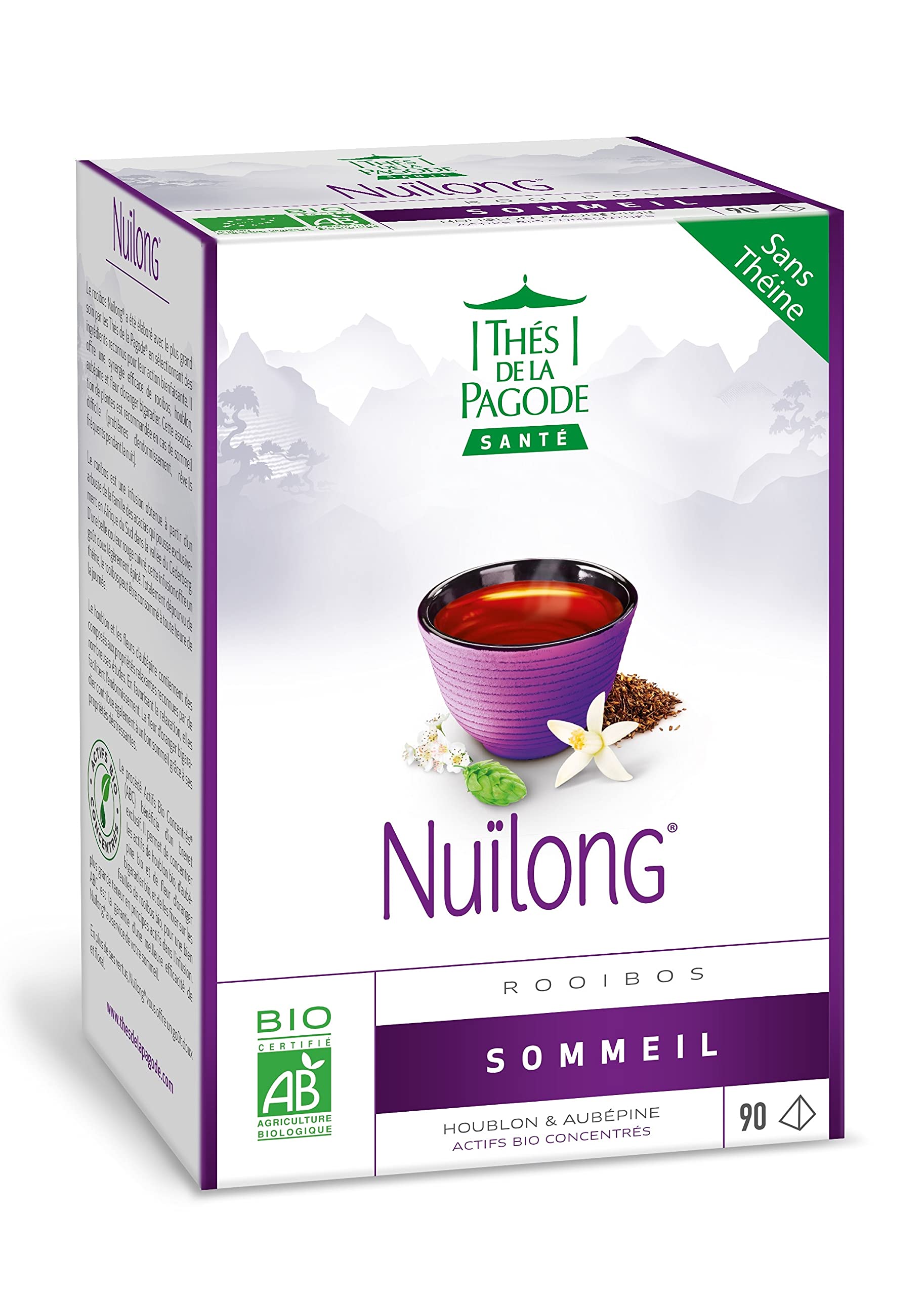 A subtly flavored infusion that helps you fall asleep! Nuïlong Rooibos, in a box of 30 tea bags, combines the sedative action and the gustatory and medicinal benefits of several beneficial plants to help you rediscover peaceful nights. Having trouble falling asleep and frequent awakenings? Nature offers a simple and delicious remedy through the combination of South African rooibos, hops, hawthorn, and bitter orange blossom! A cocktail of benefits, the caffeine-free Nuïlong Rooibos infusion helps you relax and reduces anxiety for restful nights. The rooibos in Nuïlong Rooibos is harvested from a bush belonging to the acacia family, found only in the Cederberg Valley. It is prized in South Africa for its beautiful coppery color and spicy flavor. Naturally caffeine-free, it also provides a refreshing drink throughout the day. These qualities are further enhanced by the addition of hops and hawthorn, known for their sedative and relaxing effects, and brigadier orange blossom, whose essential oil contains stress-relieving properties. Thanks to TeaPlus Expertise, the active ingredients of the plant extracts are directly bound to the rooibos leaves. Nuïlong Rooibos therefore concentrates 10 to 20 times more relaxing and sedative properties than a classic herbal infusion. Nuïlong Rooibos is packaged in transparent, pyramid-shaped pagoda bags that allow the rooibos leaves to fully release their aroma. It makes an original and refined gift for Christmas or a birthday! SAFETY WARNING May contain allergens. Not recommended for individuals allergic to the listed ingredients. Do not consume if you are allergic to any of the ingredients. Consult a healthcare professional prior to use if you are pregnant or breastfeeding. Do not consume more than 2 cups per day. Avoid consumption before activities requiring alertness.