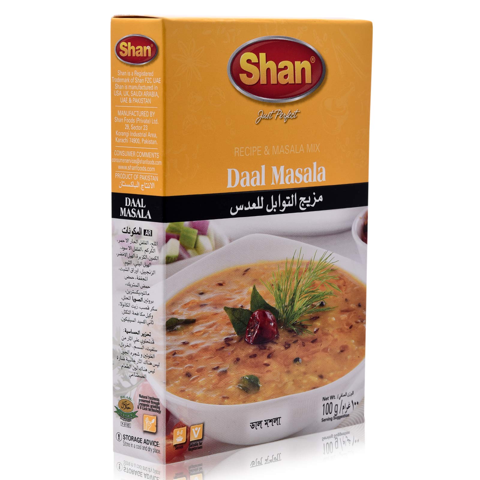 Shan Daal Masala has the perfect blend of spices, which helps you prepare rich, spicy and creamy lens curry for a light and healthy meal. INSTRUCTIONS FOR USE Please contact the product image for instructions and recipesShan Daal Masala – 100 g Shan Daal Masala heeft de perfecte mix van specerijen, die je helpt om rijke, kruidige en romige lenscurry voor een lichte en gezonde maaltijd te bereiden. GEBRUIKSAANWIJZING Neem contact op met de productafbeelding voor gebruiksaanwijzing en recepten
