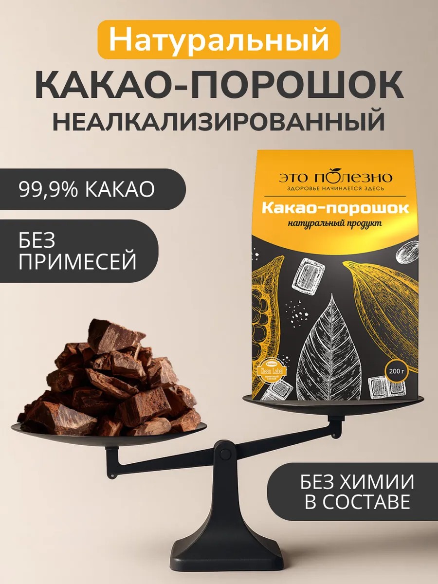 Какао-порошок ЭТО ПОЛЕЗНО - 100% натуральный продукт из какао бобов высокого качества без добавок и ароматизаторов. Погрузитесь в истинный вкус наслаждения и настоящего шоколада! В нем сохранена вся сила и благородство природного вкуса. Это напиток здоровья и энергии, он стимулирует выработку эндорфинов - хорошее настроение будет обеспечено!
