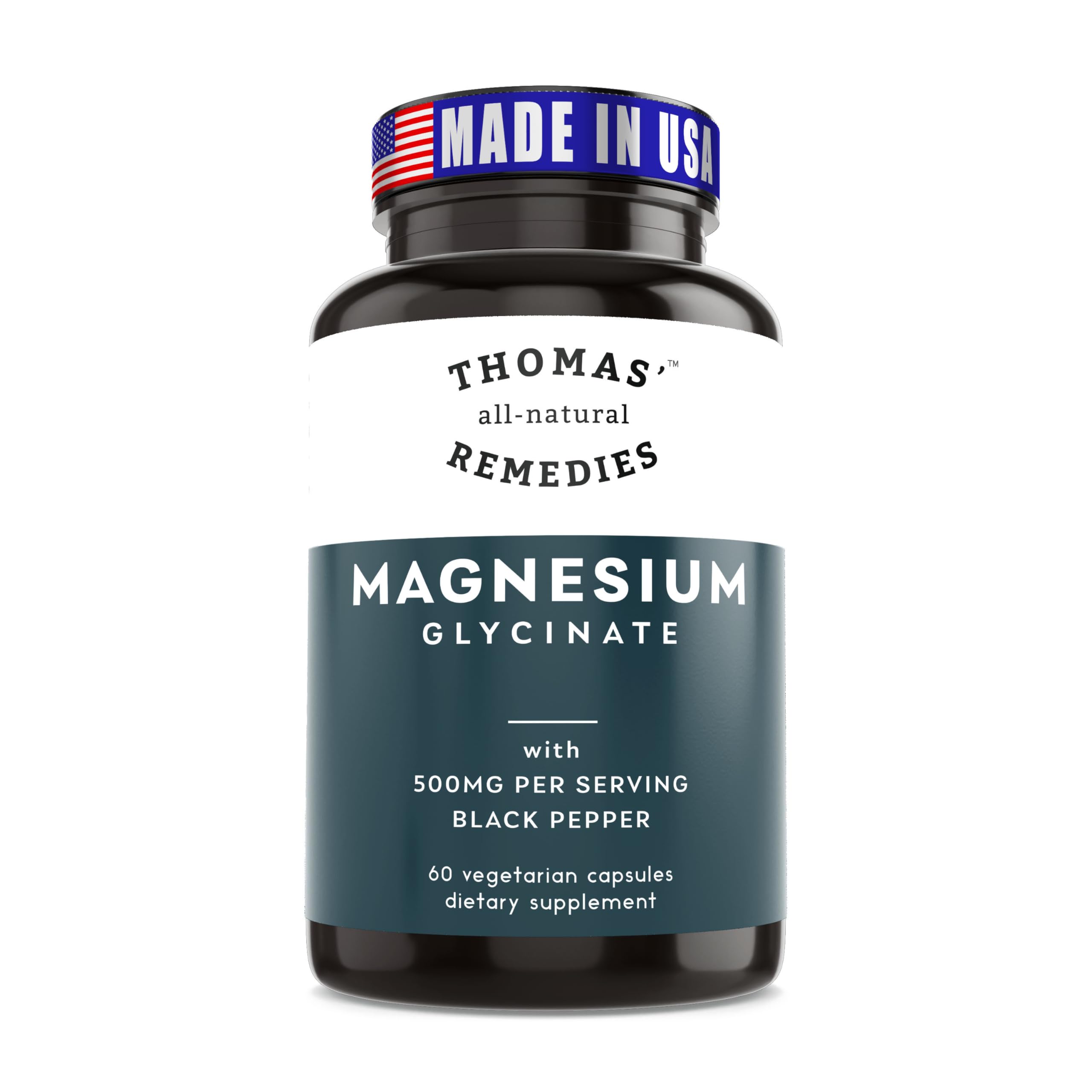 Thomas' all-natural Remedies Magnesium Glycinate Supplements High Absorption Dietary Supplements for Muscle and Bone Support Non-GMO No Fillers 60 Vegan Capsules 500mg per Serving