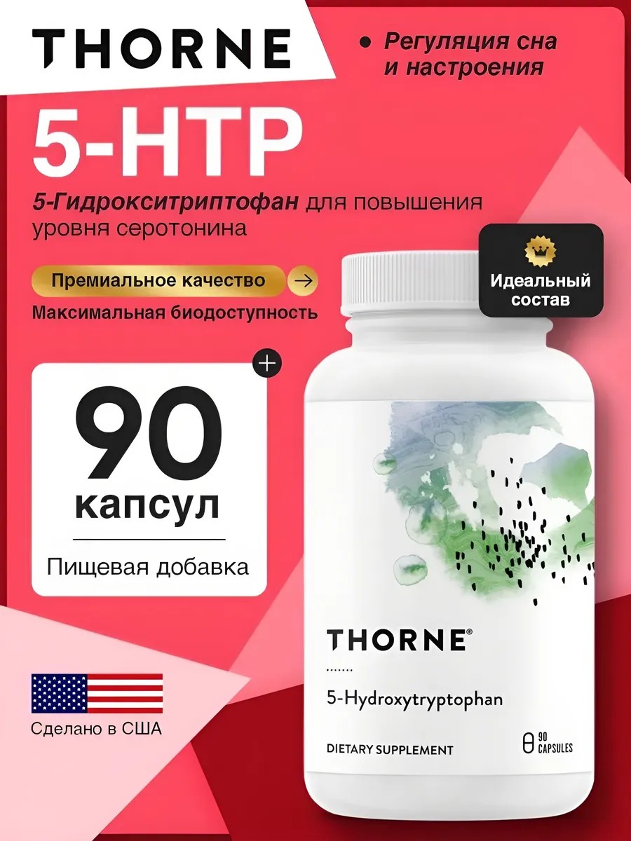 Serotonin levels in the body are linked to the regulation of sleep, mood, and appetite. Balanced serotonin levels have been shown to support restful sleep, a positive mood, and reduced cravings for sweets. There are several ways to maintain healthy serotonin levels. L-tryptophan and 5-hydroxytryptophan (5-HTP) are precursors to serotonin. However, taking 5-HTP supplements is preferable because, unlike L-tryptophan, 5-HTP cannot be repurposed for other uses in the body, such as niacin or protein production. 5-HTP is well absorbed by the body and readily crosses the blood-brain barrier, where it can increase serotonin synthesis in the central nervous system. 5-HTP can also be taken with food without reducing its effectiveness. 5-Hydroxytryptophan (5-HTP) is an intermediate metabolite produced by the body when it initiates the process of converting the essential amino acid L-tryptophan into serotonin. Therefore, supplementing with 5-HTP will bypass the conversion of L-tryptophan to 5-HTP by the enzyme tryptophan hydroxylase, which is the rate-limiting step in serotonin synthesis. This conversion can be inhibited by a number of factors, including stress, insulin resistance, aging, and deficiencies of vitamin C, folate, and iron. 5-HTP is well absorbed when taken orally, with approximately 70 percent entering the bloodstream. Intestinal absorption of 5-HTP does not require the presence of a transport molecule, and its absorption is not affected by the presence of other amino acids; therefore, 5-HTP can be taken with meals without reducing its effectiveness. 5-HTP has been shown to have beneficial effects on mood, sleep, carbohydrate cravings, and fatigue-related discomfort. Numerous studies in people with low mood have shown significant positive responses with 50–300 mg of 5-HTP daily. To further stimulate serotonin production, Thorne's 5-HTP formula contains pyridoxal-5-phosphate, the active form of vitamin B6 and an essential cofactor for converting 5-HTP to serotonin. 5-HTP is commercially produced by extracting the seeds of the African plant Griffonia simplicifolia. Each batch is thoroughly tested for contaminants, including Peak X, and is Peak X-free. Benefits: Improves sleep. Helps manage stress. Reduces cravings for sweets. The Thorne team meticulously monitors every stage of production, from mixing raw materials to encapsulation and bottling the finished product. The company refuses to use magnesium stearate or any other arbitrary fillers that could interfere with absorption, as useless ingredients contradict the company's beliefs. Compliance with the highest quality standards is confirmed by full product certification. Thorne's facility is NSF-certified and produces over 30 sports products with this certification, giving athletes complete confidence in their supplements. This is especially important for the US National Teams, NBA, NFL, and UFC, with whom Thorne is the exclusive supplier. Thorne products are made only from natural ingredients. The body absorbs nutrients more quickly and efficiently because the vitamins are free of impurities. The Thorne line offers over 300 products that help people replenish vital substances for normal body function. The safety and effectiveness of ingredients are confirmed by research. Our formula is free of unwanted fillers and impurities. We test product quality at every stage of production in our own laboratories, while most competitors test their products only once or twice. Directions: Take 1-2 capsules three times daily or as recommended by a healthcare professional. Contraindications: Individual intolerance to any of the ingredients. If you are pregnant, breastfeeding, taking any medications, or have any medical condition, consult a healthcare professional before taking any dietary supplement. Warnings: Keep out of reach of children. Do not exceed the recommended dosage. Not a medicine. Contents: 1 bottle, 90 capsules.