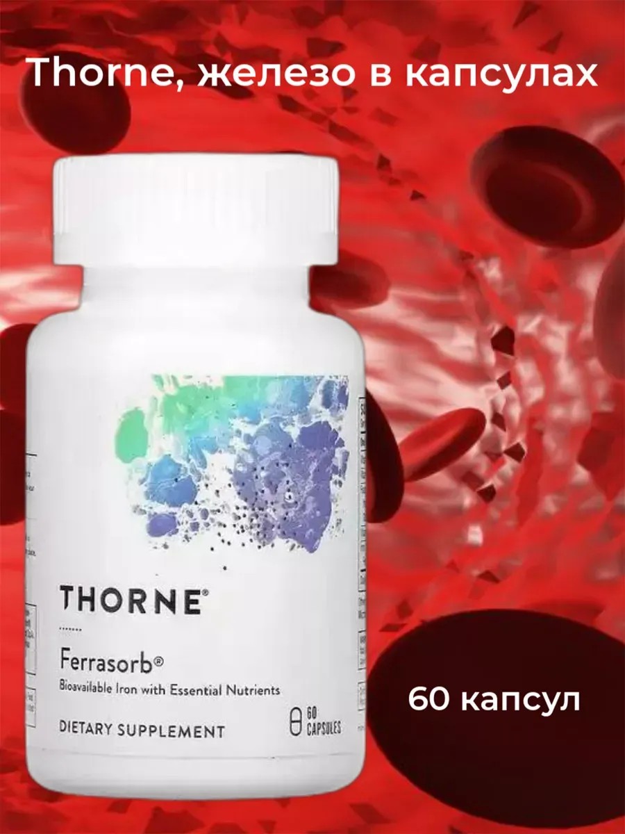 Thorne Research Ferrasorb, железо с кофакторами, 60 капсул