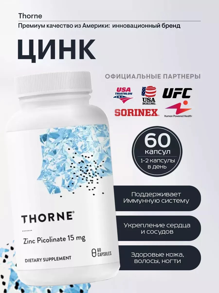 Directions for use: Take 1 capsule 1-2 times daily. Consult a physician before use. Thorne Research Zinc Picolinate is a high-quality supplement that makes a great gift for caring men and women. Each capsule contains zinc, which actively supports adult health. This dietary supplement helps improve metabolism, which is important for increasing energy and vitality. Zinc plays a key role in maintaining immunity, making it indispensable during colds and illnesses. Taking this supplement will help your body resist infections and activate its defense mechanisms. Its antioxidant protection helps neutralize free radicals, thereby reducing the risk of various diseases. In addition, Zinc Picolinate supports healthy skin, hair, and nails. You will enjoy smooth, acne-free skin, and your hair will be strong and shiny. The effectiveness of this supplement lies in its ability to improve wound healing and tissue regeneration, which is especially important for athletes or people with an active lifestyle. Don't forget the importance of hormonal balance, which zinc also supports. This nutrient plays a role in regulating many processes in the body, including brain and vision function. Bone health is also important – zinc is essential for strengthening them. The product is available in convenient capsule form, easy to include in your diet with food. It is suitable for both men and women looking to improve their health. This natural supplement is manufactured in the USA in compliance with all quality standards. When you purchase Zinc Picolinate from Wildberries, you receive an original product with a guaranteed effectiveness. Support your health today! Improved skin and overall well-being await you – take a step towards a better body with this beneficial dietary supplement!