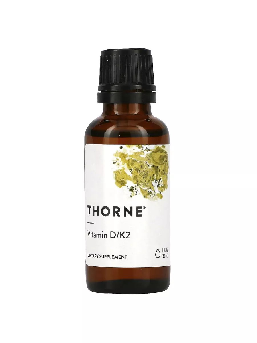 Поддерживает здоровье костей и мышц, а также нормальную работу сердечно-сосудистой и иммунной систем.. Жидкие витамины D и K2 — удобный способ получать одновременно витамины D и K2, обеспечивая более эффективную поддержку для костей, иммунной и сердечно-сосудистой систем по сравнению с приемом этих же витаминов по отдельности.. Как витамин D, так и витамин K2 способствуют улучшению состояния костей и мышц, а также улучшению работы сердечно-сосудистой и иммунной систем. Важно поддерживать оптимальный уровень витамина D в организме на протяжении всей жизни от внутриутробного периода до старости. Витамин K2, представляющий собой серию молекул, известных как менахиноны, оказывает более эффективное воздействие на кости, чем витамин K1. Витамин K2, входящий в состав данного препарата — хорошо изученный MK-4. Прием смеси витаминов D и K может оказать более эффективное воздействие на иммунную и сердечно-сосудистую системы, чем прием этих витаминов по отдельности. Например, витамин D необходим для усвоения кальция, а витамин K важен для транспортировки кальция к костям и его отвода от мягких тканей, таких как кровеносные сосуды и почки. Кроме того, жидкий витамин D и K2 от Thorne также является источником дополнительных питательных веществ для онкобольных.. Исследование с участием женщин в период наступившей менопаузы показало, что прием микроэлементов в сочетании с витаминами D и K способствует сохранению эластичности артерий по сравнению с двумя другими группами женщин, которые принимали либо микроэлементы с витамином D, либо плацебо, но не получали витамина K. Жидкий витамин D и K2 от Thorne входит в состав масла среднецепочечных триглицеридов с добавлением смешанных токоферолов в качестве консерванта.. Рекомендации по применению . Принимать по 2 капли 1–3 раза в день или в соответствии с рекомендациями врача. Переверните бутылочку, чтобы отмерить необходимое количество капель. Кроме того, данный продукт можно добавлять в пищу или напитки. Не следует хранить в холодильнике.. Ингредиенты: . Масло среднецепочечных триглицеридов, смешанные токоферолы.. Защитная пленка: Продукт следует использовать лишь в том случае, если упаковка запечатана. . Хранить упаковку плотно закрытой в сухом и прохладном месте.Перед началом применения во время беременности следует проконсультироваться с врачом.
