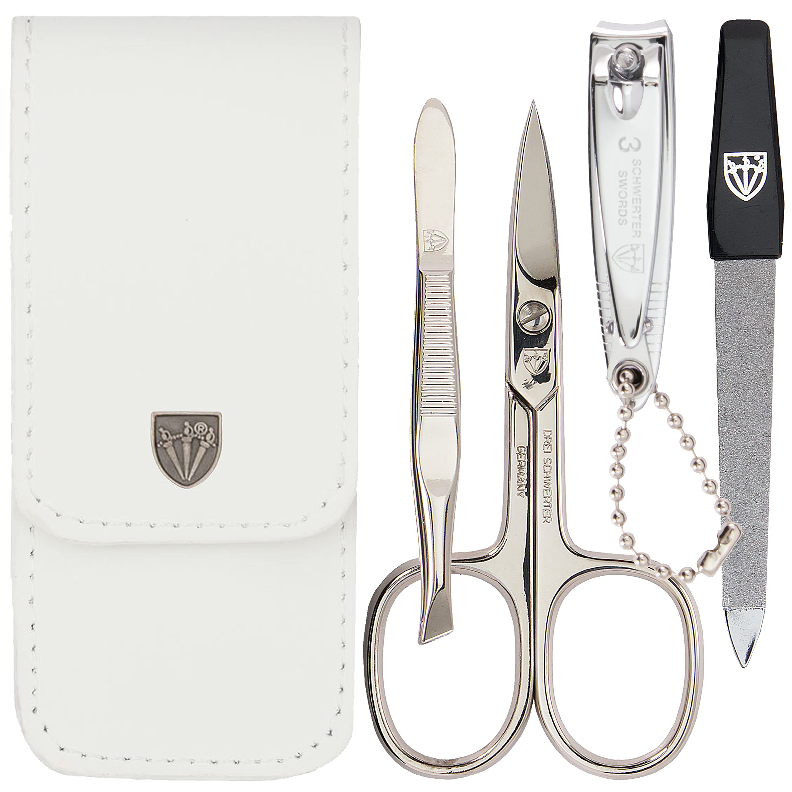 Three swords,Made in Germany - first -class tested three swords of the brand quality since 1927, highly glossed and polished.Our precisely forged scissors made in Germany are really screwed and meet the highest demands.Ideal gift- the manicure and pedicure set is a perfect gift for all occasions, be it Christmas, birthday or Valentine's Day.It is an indispensable tool for well -groomed hands and feet and is delivered in an attractive, stable gift box.With synthetic leather case - our steel instruments are geared towards durability and precision.The white synthetic leather's case has a stable push button closure and is not only practically a highlight for hygienic stowing, but also optically.High -quality products - the set includes nail scissors, a nail clipper, tweezers and a sapphire nail file with a rough and fine side, all made of first -class brand quality.The steel instruments are highly glossed in and polished.Manicure set 'Capri'- The 4-part 'Capri' manicure pedicure set convinces with high-quality instruments for precise hand and foot care.The set is ideal for at home and on the go and is delivered with a microfiber cloth for gentle cleaning.