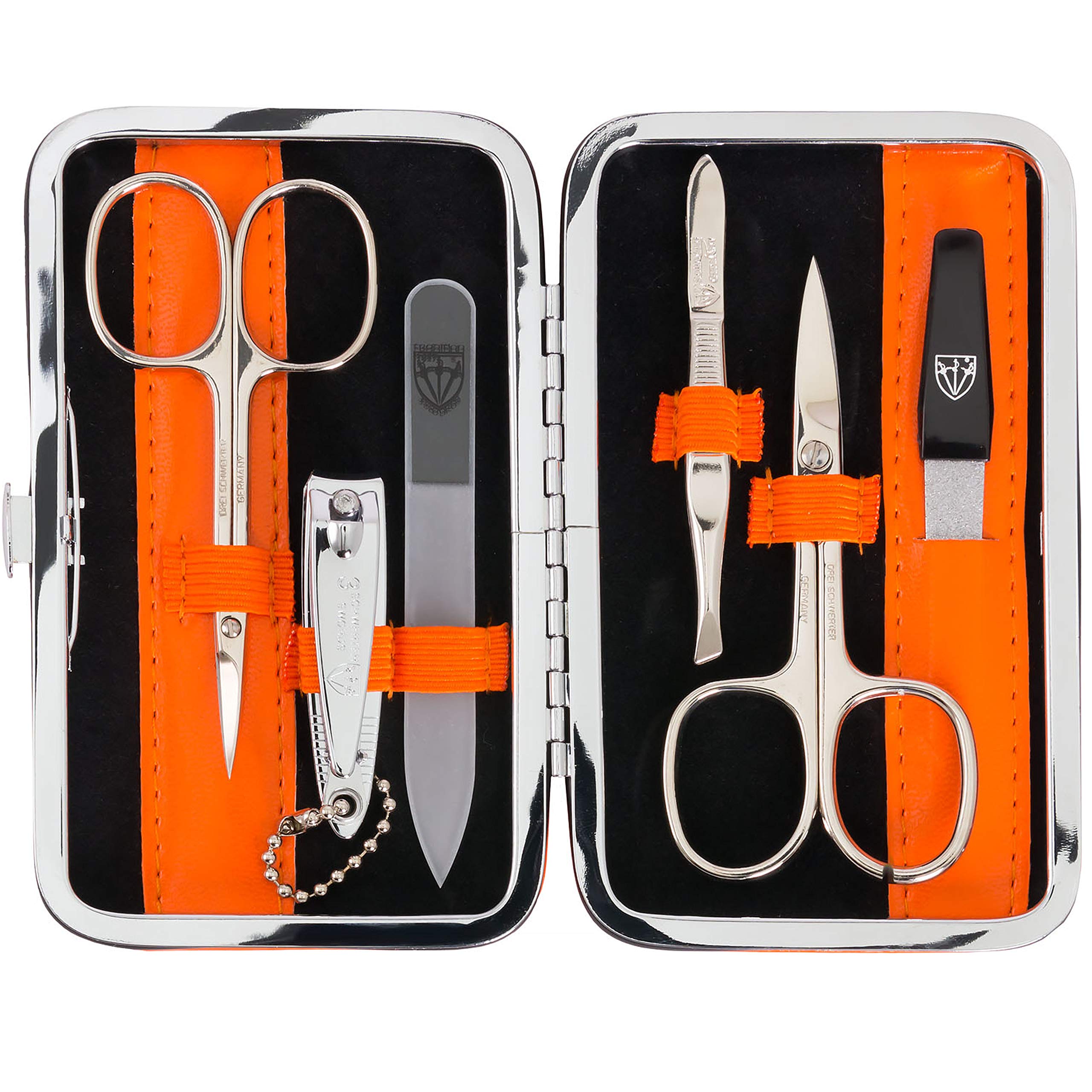 GENERAL INFORMATION Manicure set of three swords - tested brand quality since 1927 Instructions Daily use for perfectly maintained finger and toenails Warnings Please keep away from children. Moregift idea: Our high -quality hand - foot - care - necessaires and travel sets for women and men are ideal as a gift for Christmas, birthday, Valentine's Day and for many other occasions.A nail nessesair and care set for the manicure and pedicure is an indispensable must have on a trip, for every household and also for the handbag - fingernails for a good appearance are and remain the best business card!.Steel instruments Nageletui: First-class tested three swords brand quality since 1927, brilliant and polished-Made in Solingen (except nail clippers),Our precisely forged scissors and pliers made in Germany are really screwed and meet the highest demands.Extensive quality controls guarantee a long shelf life of the nail set.Etui: high -quality case, synthetic leather orange, lined on the inside with soft velor velvetClosure: stable frame closure ""three swords"" for convenient handling,Dimensions (closed): approx. 12.0 x 7.5 x 2.0 cm,The etuis are made in traditional manual work, are pleasantly handy and also optically a trendy accessory.Nail set Contents (instruments 6-part): nail scissors, skin scissors, nail clippers, tweezers, glass nail files (cut double-sided), sapphire nail file (coarse fine),Gift packaging,Accessories free of charge: cleaning cloth (microfiber cloth) for cleaning the steel instruments, information - brochure ""Hand care and foot care"" with an overview of the most important nail care tools and general tips for maintaining nail recessaires.Manicure set ""Genova"" of three swords with high -quality instruments for hand care and foot care.The excellent workmanship and the highest level of precision make this manicure case a long -lasting companion for home and on the go.The exclusive look nail care set is delivered in an attractive and stable gift box.ALLGEMEINE ANGABEN Maniküreset von DREI SCHWERTER - geprüfte Markenqualität seit 1927 GEBRAUCHSANWEISUNG Tägliche Nutzung für perfekt gepflegte Finger- und Fußnägel WARNHINWEISE Bitte von Kindern fernhalten. MehrGESCHENKIDEE: Unsere hochwertigen Hand – Fuß – Pflege - Necessaires und Reisesets für Damen und Herren eignen sich hervorragend als GESCHENK zu Weihnachten, Geburtstag, Valentinstag und für viele weitere Anlässe. Ein Nagel Nessesair und Pflegeset für die Maniküre und Pediküre ist ein unverzichtbares MUST HAVE auf Reise, für jeden Haushalt und auch für die Handtasche –gepflegte Fingernägel für ein gutes Erscheinungsbild sind und bleiben die beste Visitenkarte!. STAHLINSTRUMENTE NAGELETUI: Erstklassige geprüfte Drei Schwerter-Markenqualität seit 1927, glanzvernickelt und poliert – Made in Solingen (außer Nagelknipser),Unsere präzise geschmiedeten Scheren und Zangen Made in Germany sind echt verschraubt und genügen höchsten Ansprüchen. Umfangreiche Qualitäts - Kontrollen garantieren eine lange Haltbarkeit des Nagelsets. ETUI: Hochwertiges Etui, Kunstleder orange, innen gefüttert mit weichem Velours Samtstoff,VERSCHLUSS: Stabiler Rahmenverschluss "Drei Schwerter" für die bequeme Handhabung,ABMESSUNGEN (geschlossen): ca. 12,0 x 7,5 x 2,0 cm,Die Etuis werden in traditioneller Handarbeit gefertigt, sind angenehm handlich und auch optisch ein trendiges Accessoire. NAGEL SET INHALT (Instrumente 6-teilig): Nagelschere, Hautschere, Nagelknipser, Pinzette, Glasnagelfeile (doppelseitig geschliffen), Saphirnagelfeile (grob fein),Geschenkverpackung,ZUBEHÖR GRATIS: Reinigungstuch ( Mikrofasertuch ) zur Reinigung der Stahlinstrumente, Informations - Broschüre "Handpflege und Fußpflege" mit einer Übersicht über die wichtigsten Nagelpflege - Werkzeuge und allgemeine Tipps zur Pflege des Nagelnecessaires. MANIKÜRESET "Genova" von Drei Schwerter mit qualitativ hochwertigen Instrumenten für die Handpflege und Fußpflege. Die ausgezeichnete Verarbeitung und ein Höchstmaß an Präzision macht dieses Maniküretui zu einem langlebigen Begleiter für Zuhause und Unterwegs. Das Nagelpflegeset im exklusiven Look wird geliefert in einer attraktiven und stabilen Geschenkbox.DREI SCHWERTER - Germany 6-tlg. Maniküreset 'Genova' Maniküre Nagelset im Kunstlederetui Orange Inhalt: Nagelschere, Hautschere, Nagelknipser, Glasnagelfeile, Pinzette, Saphirnagelfeile ORANGE - KUNSTLEDER