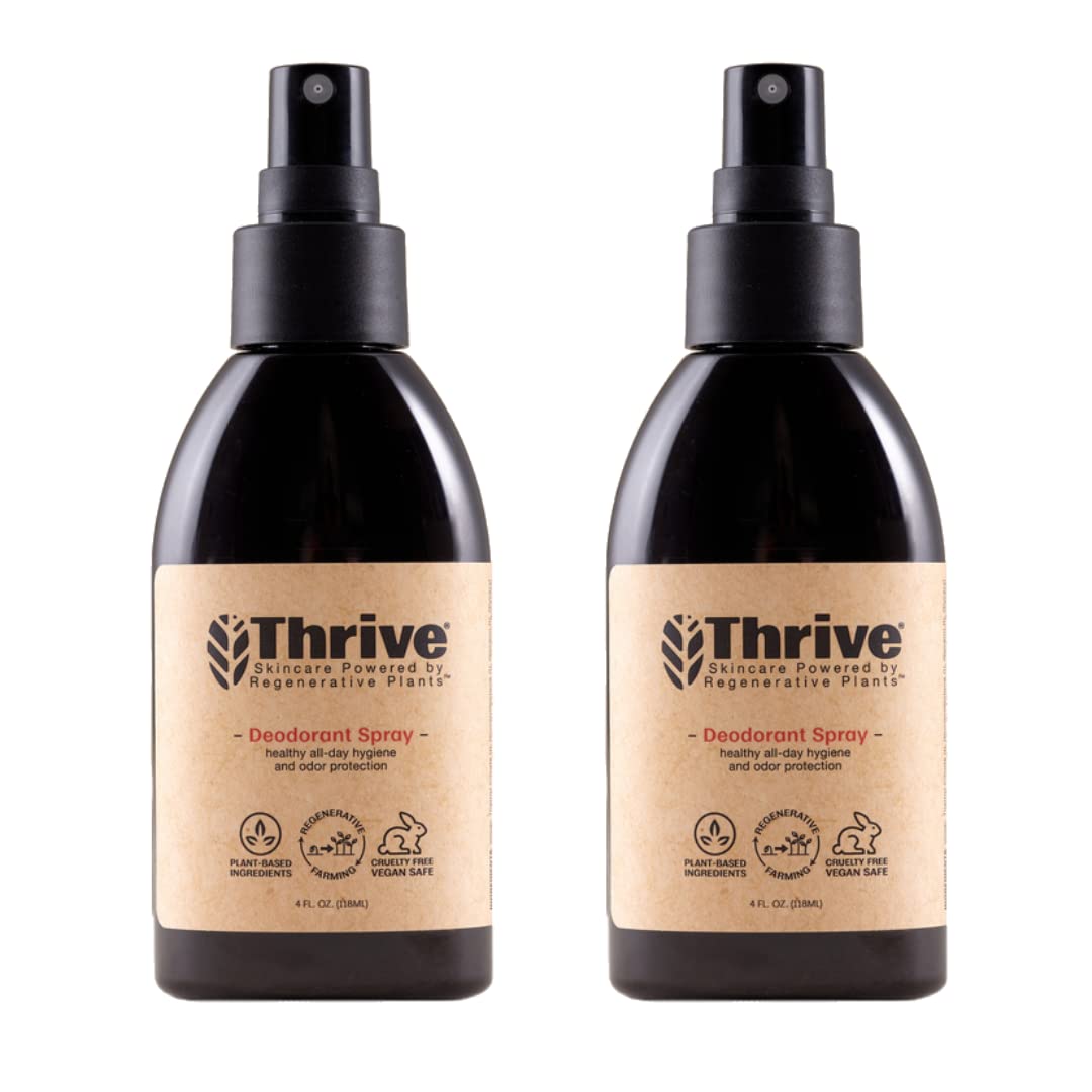 SUPPORTS COSTA RICAN FARMERS – With every purchase, you get a healthy natural deodorant while helping support the rural farmers who produced our super plants through regenerative farming. Thrive’s business model and supply chain is designed to help farmers restore degraded soil on their land and improve their livelihood. Each customer purchase helps grow this positive footprint plant by plant. HIGH PERFORMANCE & SATISFACTION GUARANTEED - Healthy, non-toxic, and non-irritating natural formula that is totally free of aluminum, baking soda, alcohol and irritating synthetic ingredients. Natural deodorant spray, cruelty-free, vegan, PABA-free, GMO-free, paraben-free, no synthetic colors, fragrances or ingredients. 100% Satisfaction Guarantee: if you don't love your Thrive Natural Spray Deodorant, we'll refund your purchase. NON-IRRITATING FORMULA & EFFECTIVE NATURAL INGREDIENTS- Aluminum free deodorant spray powered by Thrive’s antioxidant rich Costa Rican super-plants, Juanilama & Fierrillo. Our regenerative plant-derived formula helps reduce irritation and redness while helping restore, heal & protect your under arm skin. Gentle & safe for sensitive skin. No residue, white patches or sticky feeling. Fresh, subtle, sophisticated scent for men & women. BETTER HYGIENE & ALL DAY ODOR PROTECTION - many natural deodorant formulas target two or three of the causes of body odor, but not all four (perspiration, unwanted germ growth, sweat degradation, bad odors). Thrive’s unique combination of clinically tested ingredients and formulation creates a new-to-market, more effective option. Our natural spray deodorant helps control unwanted germ growth, inhibits bad odors from sweat degradation and effectively deodorizes all day. HEALTHIER NATURAL DEODORANT FOR WOMEN & MEN - Unique-to-Thrive blend of super-plant extracts from Costa Rica, Fierrillo & Juanilama, combined with innovative natural ingredients including Horsetail & Sage, work with your body’s natural process to eliminate odor instead of covering it up. Practical, non-aerosol spray for a more gentle & cleaner application. Provides all-day hygiene under arms or anywhere odor develops (all over your body, clothing, inside shoes, etc).
