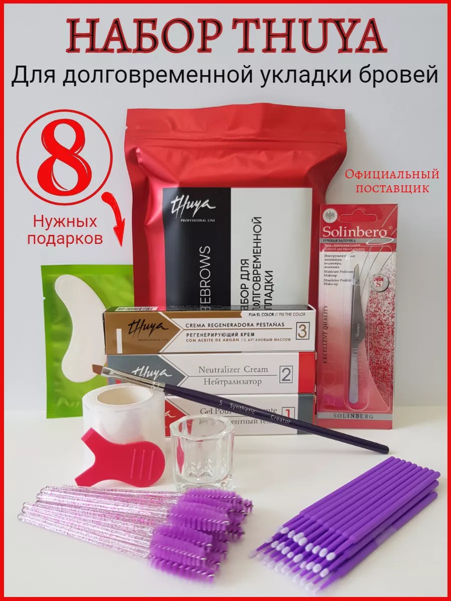 | Package contents | Thuya permanent gel for eyebrow and eyelash lamination, step 1, DU; Thuya cream neutralizer, step 2, DU; Thuya regenerating cream for eyebrows and eyelashes with argan oil, step 3, DU; Solinberg hand-sharpened tweezers x 1; Synthetic 5 brush x 1; Lamination film x 1; Mixture cup x 1; Nylon eyelash and eyebrow brushes x 50; Eyelash and eyebrow microbrushes x 100; Disposable eye patches x 1; Eyelash lamination applicator x 1. |