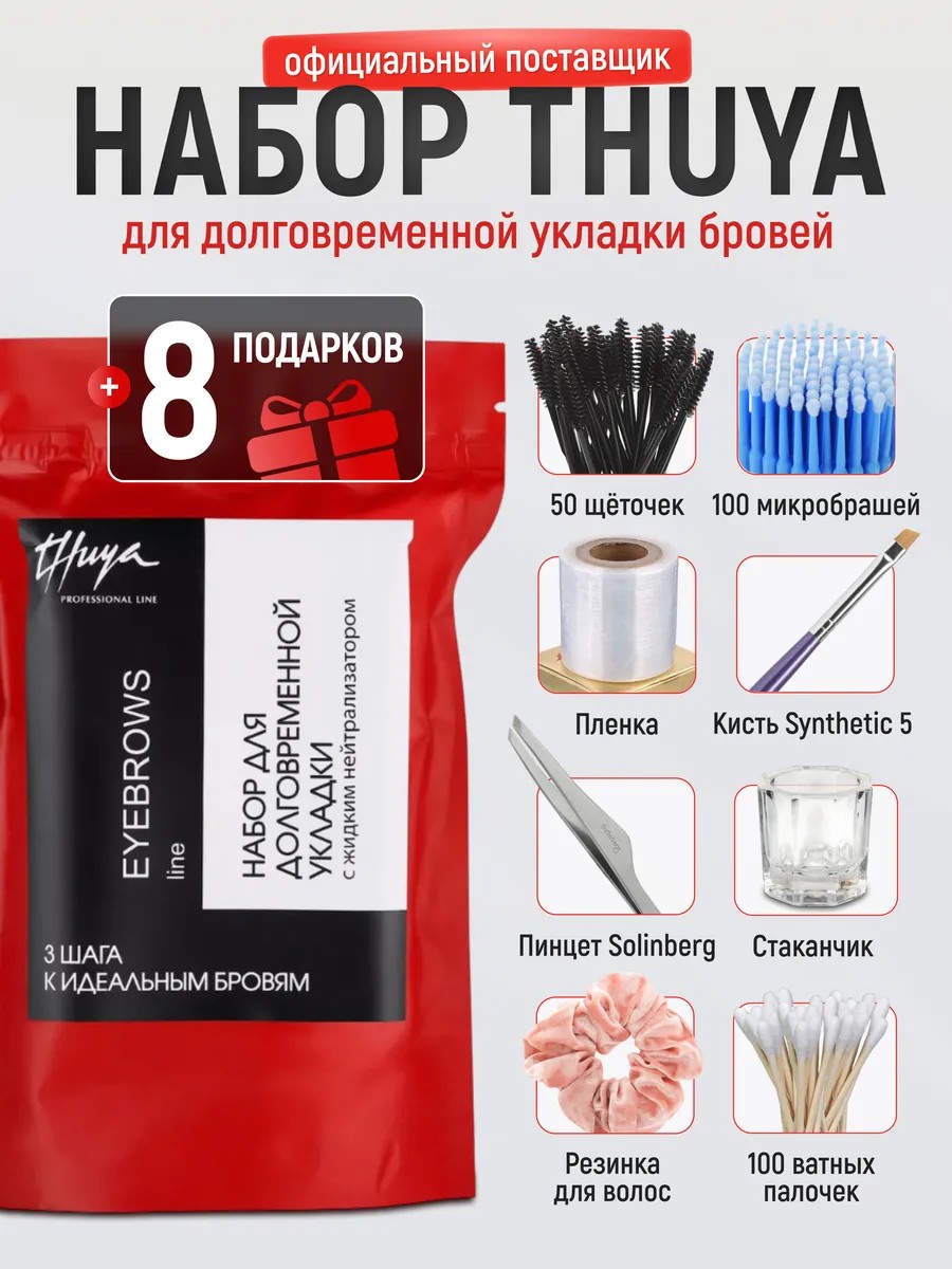 | Комплектация | Регенерирующий крем для бровей и ресниц с маслом арганы Thuya 3 шаг ДУ; Перманентный гель для ламинирования бровей и ресниц Thuya 1 шаг ДУ; Кремовый нейтрализатор Thuya 2 шаг ДУ; Кисть Synthetic 5 (1 шт); Стаканчик для составов (1 шт); Плёнка для ламинирования (1 шт); Резинка для волос-1 шт.; Пинцет для бровей Solinberg G801з ручной заточки (1 шт); Нейлоновые щёточки для ресниц и бровей (50 шт); Микробраши для ресниц и бровей (50 шт); Ватные палочки (100 шт) |