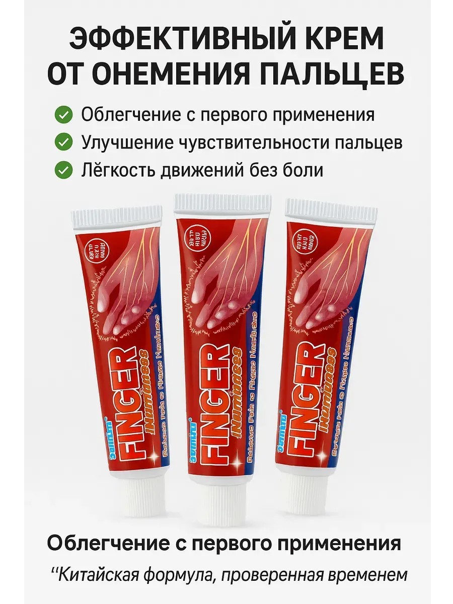 Finger Numbness Cream is an effective remedy for numbness in the hands, designed specifically to restore skin sensitivity and relieve discomfort in the hands, fingers, and joints. Thanks to a combination of Chinese herbal extracts, camphor, menthol, and auxiliary components, the product penetrates deep into tissue, improves microcirculation, and relieves paresthesia.