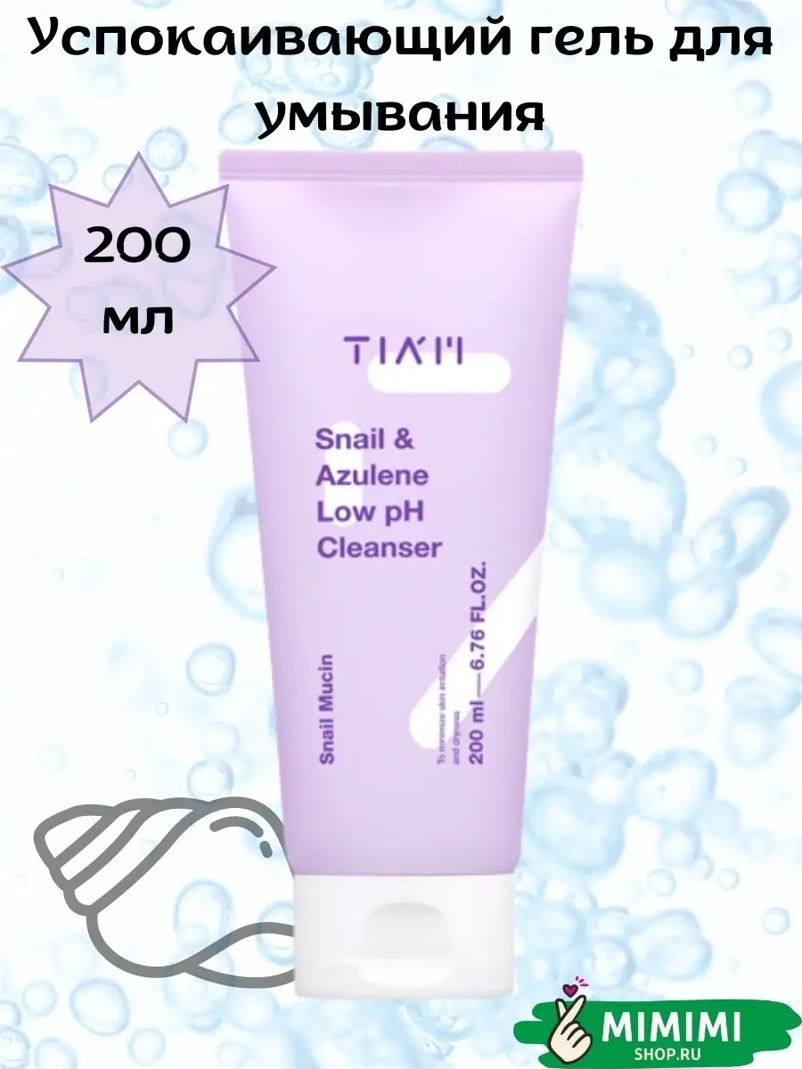 TIAM Snail & Azulene Low pH Cleanser, a soothing cleansing gel with snail mucin, gently cleanses the skin, soothing irritation and redness. It strengthens the protective barrier, eliminates dryness and flaking, and maintains optimal water-lipid balance. This cleansing gel gently removes dirt, makeup, and excess sebum, protecting the skin from the harsh effects of hard water and preventing dehydration. It softens, improves elasticity and density, and smoothes the skin's microrelief. It prevents inflammation and accelerates healing and renewal. This gel-like texture transforms into a soft foam upon contact with water that rinses off easily without leaving a tight feeling. Suitable for all skin types. Directions: Apply a small amount of gel to damp palms, lather, and gently wash your face. Rinse off the gel with warm water.