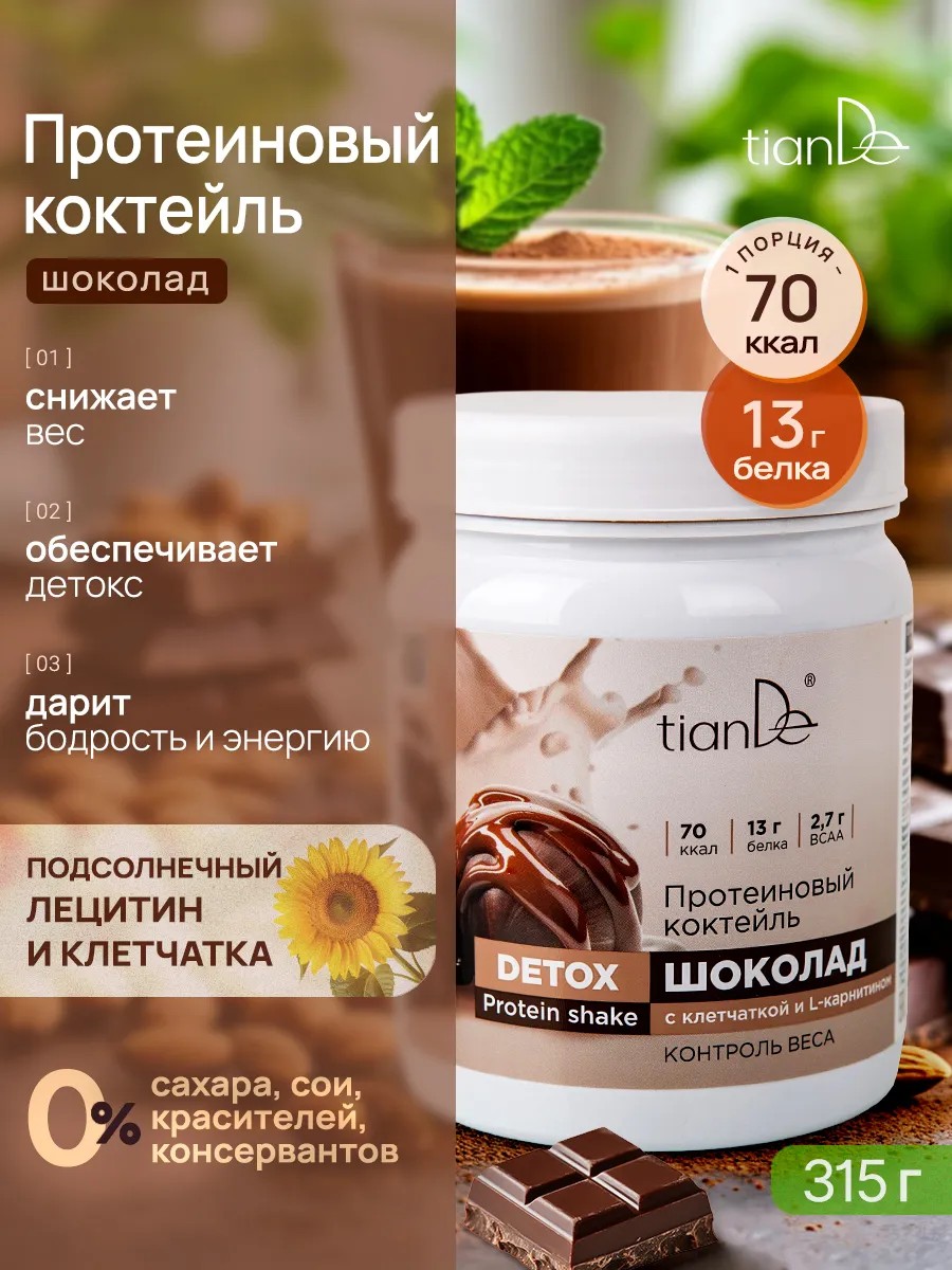 Протеиновый коктейль TianDe – это 70 килокалорий и 13 г белка на порцию. Благодаря составу напиток для похудения обеспечивает: