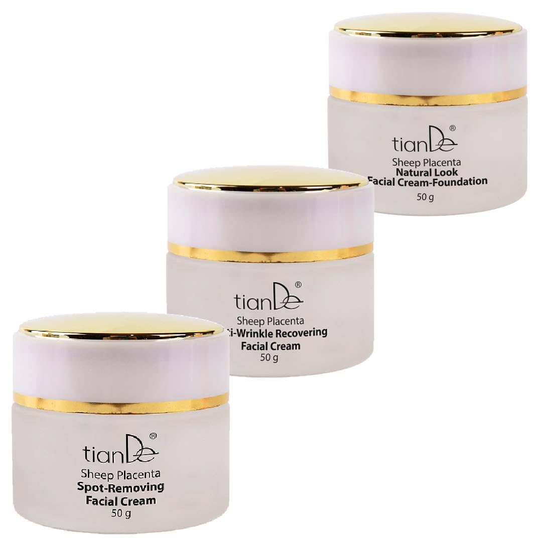 Enjoy younger and rejuvenated skin with the Sheep Placenta Cream Set from tianDe. With regular use, the skin looks younger and smoother, as the creams promote cell renewal and deep moisture. In addition, its light, non-greasy texture allows easy application and absorption. These creams help improve skin elasticity, reduce wrinkles and fine lines, and improve the appearance of blemishes and uneven tone. They are ideal for all skin types, even the most sensitive. At the same time, it adjusts the properties of the correction and care cream - compensates for the color, masks imperfections and gives the skin a fresh appearance. Perfectly moisturizes, protects the skin from negative environmental factors. The sheep placenta is known for its skin regenerating and nourishing properties. Each cream in this set is enriched with essential vitamins and minerals to maintain healthy and radiant skin. Sheep planta: eliminates signs of aging. Rejuvenating your skin is easy. Use Sheep Placenta products that contain the iconic anti-aging ingredient: placenta extract!.TianDe Schapenta-crèmes, TianDe, 3 x 50 g, verwijdert tekenen van verouderingGeniet van een jongere en verjongde huid met de schaap Placenta crèmeset van tianDe. Bij regelmatig gebruik ziet de huid er jonger en gladder uit, omdat de crèmes de celvernieuwing en diepe vochtigheid bevorderen. Bovendien maakt de lichte, niet-vette textuur een eenvoudige toepassing en absorptie mogelijk. Deze crèmes helpen de huidelasticiteit te verbeteren, rimpels en fijne lijntjes te verminderen en het uiterlijk van vlekken en ongelijkmatige tinten te verbeteren. Ze zijn ideaal voor alle huidtypes, ook voor de meest gevoeligste. Tegelijkertijd past het de eigenschappen van de correctie- en verzorgingscrème aan - compenseert de kleur, maskeert onvolkomenheden en geeft de huid een frisse uitstraling. Hydrateert perfect, beschermt de huid tegen negatieve omgevingsfactoren. De placenta van het schaap staat bekend om zijn huidregenererende en voedende eigenschappen. Elke crème in deze set is verrijkt met essentiële vitaminen en mineralen om een gezonde en stralende huid te behouden. Schapsplanta: elimineert tekenen van veroudering. Het verjongen van je huid is eenvoudig. Gebruik Sheep Placenta producten die het iconische anti-aging ingrediënt bevatten: placenta extract!.