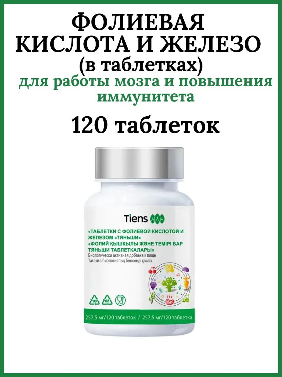 Фолиевая кислота — это витамин В9, необходимый для роста и размножения клеток. В фолиевой кислоте нуждается наш иммунитет, нервная и сердечно-сосудистая система и метаболизм. Это один из важнейших компонентов для здоровья организма.Витамин В9 участвует в образовании эритроцитов и гемоглобина, укрепляет стенки сосудов и способствует нормальной работе сердца, снижая риск возникновения инфаркта. Фолиевая кислота нужна для нормального функционирования нервной системы — следовательно, от нее зависит наш психологический настрой, концентрация и работоспособность.Особенно необходима фолиевая кислота для молодых женщин в период планирования беременности для максимального обеспечения благополучного течения процессов построения нового организма.Большая часть витамина В9 должна поступать в организм вместе с пищей. Однако рацион современного человека достаточно скуден, поэтому нехватка фолиевой кислоты в наши дни – не редкость.Фолиевая кислота:· регулирует процессы деления клеток;· способствует предотвращению атеросклероза;· способствует нормализации обмена веществ;· стимулирует защиту организма от инфекций;· полезна для работы мозга, повышает интеллектуальные способности человека.Железо – это микроэлемент, необходимый для работы любой клетки. Оно обеспечивает клеточное дыхание, участвуя в процессе передачи кислорода всем тканям и системам организма и удаляя из клеток углекислый газ. Железо является основой многих ферментов и белков, задействованных в холестериновом обмене, переводе калорий в энергию, выведении отравляющих веществ из организма.Железо:· участвует в синтезе гемоглобина;· отвечает за доставку кислорода к органам;· увеличивает сопротивляемость организма;· поддерживает иммунитет;· регулирует тканевое дыхание.В каждой таблетке содержится:железо – 7 мг, фолиевая кислота – 135 мкг.Рекомендации по применению:детям от 7 до 14 лет – по 1 таблетке 1 раз в день во время еды;детям от 14 лет и взрослым – по 1 таблетке 2 раза в день.Меры предосторожности: продукт не является лекарством, нерекомендуется употреблять в количестве, превышающем норму, либоодновременно с аналогичными препаратами.