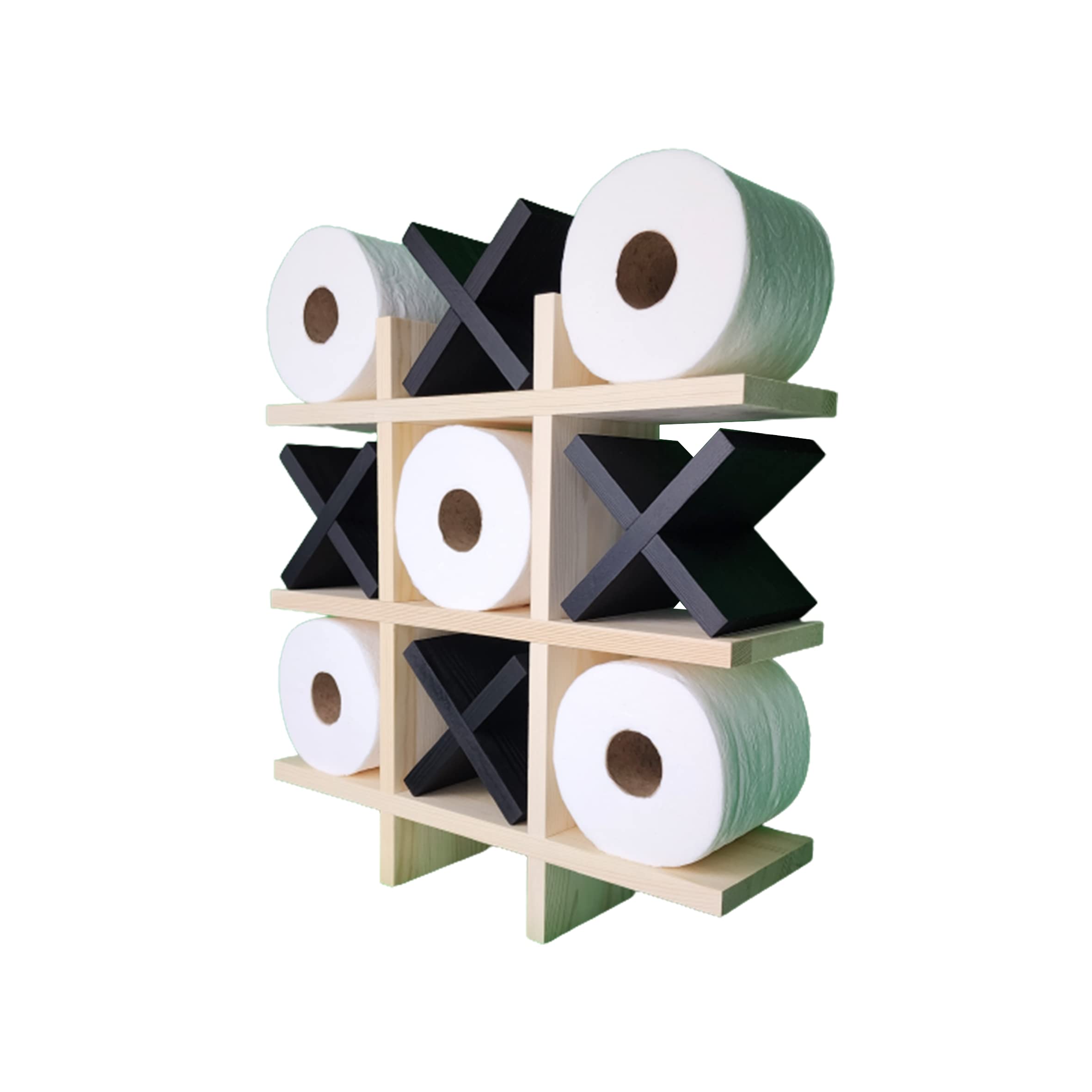 Introducing the Tic Tac Toe Toilet Paper Holder, made of premium pine wood and designed for both wall-mounting and free-standing options. This unique and functional bathroom accessory will add a touch of rustic charm to your bathroom decor. The holder features a classic tic tac toe game design with Xs and Os, and can hold up to five standard or jumbo rolls of toilet paper. The holder is easy to install with the included hardware, and its sturdy design ensures it will securely hold the toilet paper rolls and other bathroom items such as crystals, small plants, candles, decorative towels, photos and bathroom products . The holder is made from premium pine wood, which gives it a rustic, natural look that will complement any bathroom decor. Whether you're looking for a fun and functional addition to your own bathroom or a thoughtful gift for family and friends, the Tic Tac Toe Toilet Paper Holder is the perfect choice!
