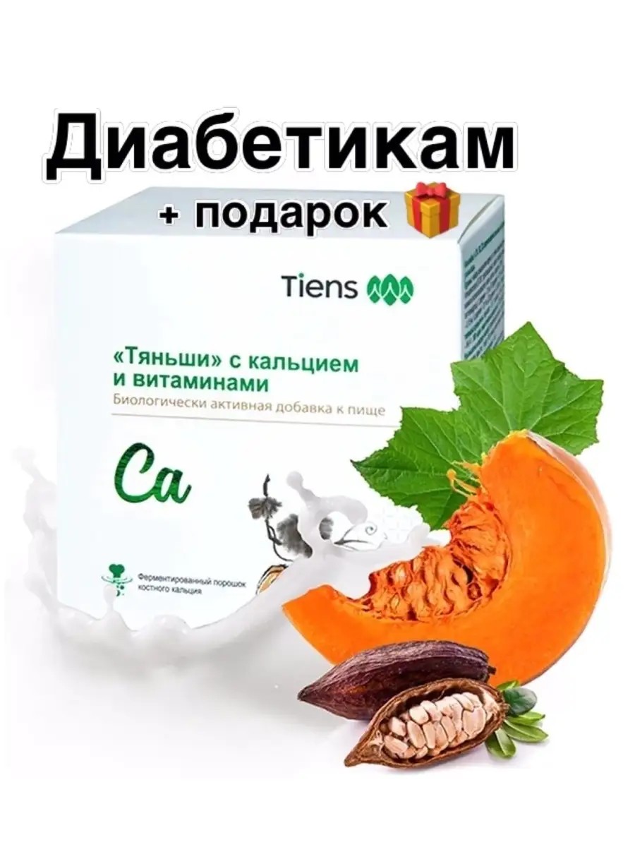 **Even more calcium and vitamins!** Replenishes calcium deficiency in the body, prevents the development of osteoporosis, regulates blood sugar levels and nutrient balance, increases physical and mental activity, strengthens the body's resistance to stress. **The ideal balance of calcium and vitamin D3. Tiens** with calcium and vitamins is specially designed for people with high blood sugar levels, diets, and diabetes. Thanks to pumpkin powder, it not only saturates the body with calcium, but also regulates blood sugar. **Benefits:** Perfectly balanced active ingredients help normalize metabolism in the body, form bones and teeth, regulate heart function, blood sugar levels, and nervous activity. The supplemented formula of natural ingredients helps saturate the body with vitamins A, B1, B2, C. Calcium Tiens Tiens Tiens with calcium and vitamins