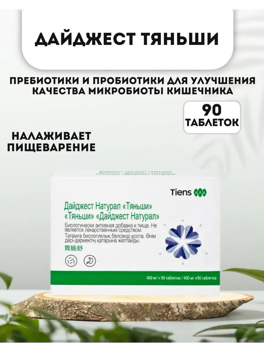 A healthy digestive system is the key to overall health. To improve digestion and normalize gastrointestinal function, the company introduces a new product – Tiens Digest. Scope: as a source of probiotic microorganisms (bifidobacteria and lactobacilli), an additional source of soluble dietary fiber. **Main ingredients: **inulin, flax seeds, apple pectin, anise, bifidobacteria, acidophilus lactobacilli, insoluble fiber. **Product benefits: **— plant fiber is responsible for a quick feeling of satiety, reduced appetite, nutrition of beneficial microflora;— dietary fiber is a gentle but effective means of cleansing the body;— inulin naturally ferments and nourishes healthy intestinal microflora;— flaxseed affects the resistance of the gastric mucosa and duodenum to damaging factors;— probiotic microorganisms help fight irritable bowel syndrome, gas, bloating, constipation, diarrhea and other unpleasant phenomena. **Indications for use: **• overeating, indigestion food, bloating;• excess weight;• antibiotic therapy;• dysbacteriosis;• constipation;• flatulence.**Contraindications**Individual intolerance to the components of the dietary supplement, pregnancy, breastfeeding. Before use, consult a doctor.**Release form**90 tablets of 400 mg (in a box).**Dosage and method of administration:**1 tablet 3 times a day after meals. Drink with water. Duration of admission is 1 month. If necessary, the dose can be repeated.