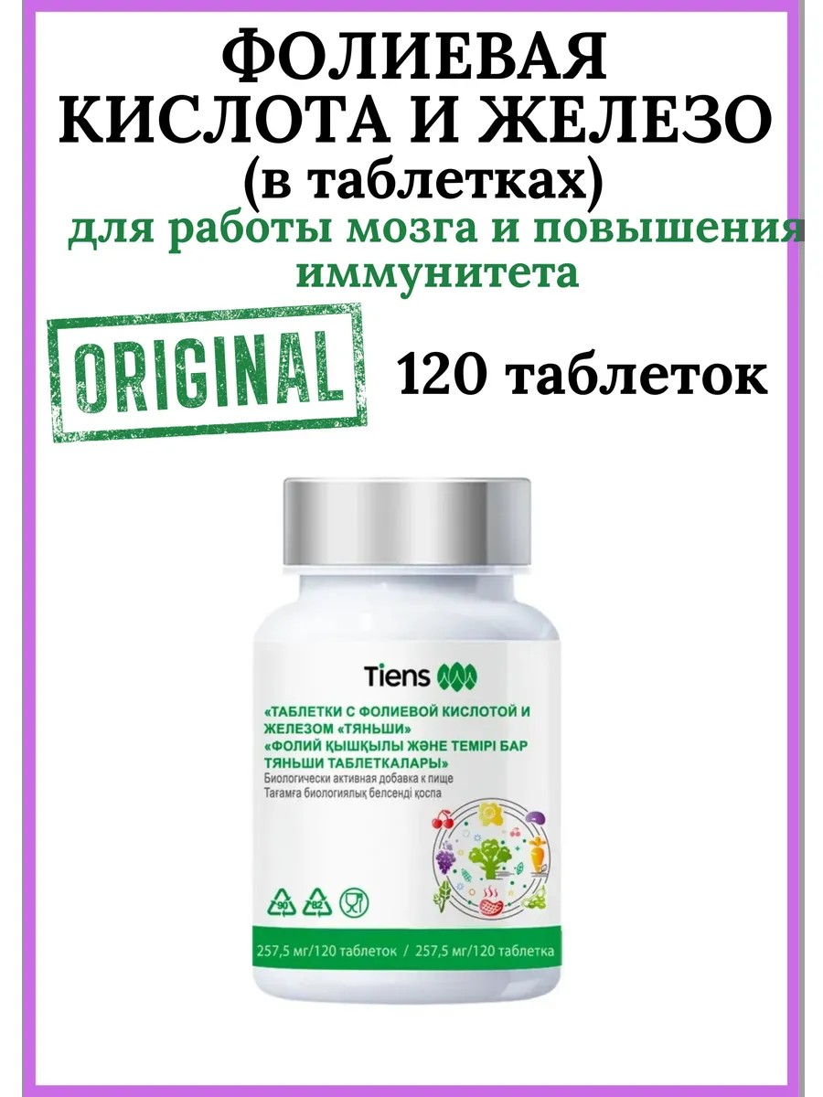 Фолиевая кислота — это витамин В9, необходимый для роста и размножения клеток. В фолиевой кислоте нуждается наш иммунитет, нервная и сердечно-сосудистая система и метаболизм. Это один из важнейших компонентов для здоровья организма.Витамин В9 участвует в образовании эритроцитов и гемоглобина, укрепляет стенки сосудов и способствует нормальной работе сердца, снижая риск возникновения инфаркта. Фолиевая кислота нужна для нормального функционирования нервной системы — следовательно, от нее зависит наш психологический настрой, концентрация и работоспособность.Особенно необходима фолиевая кислота для молодых женщин в период планирования беременности для максимального обеспечения благополучного течения процессов построения нового организма.Большая часть витамина В9 должна поступать в организм вместе с пищей. Однако рацион современного человека достаточно скуден, поэтому нехватка фолиевой кислоты в наши дни – не редкость.Фолиевая кислота:· регулирует процессы деления клеток;· способствует предотвращению атеросклероза;· способствует нормализации обмена веществ;· стимулирует защиту организма от инфекций;· полезна для работы мозга, повышает интеллектуальные способности человека.Железо – это микроэлемент, необходимый для работы любой клетки. Оно обеспечивает клеточное дыхание, участвуя в процессе передачи кислорода всем тканям и системам организма и удаляя из клеток углекислый газ. Железо является основой многих ферментов и белков, задействованных в холестериновом обмене, переводе калорий в энергию, выведении отравляющих веществ из организма.Железо:· участвует в синтезе гемоглобина;· отвечает за доставку кислорода к органам;· увеличивает сопротивляемость организма;· поддерживает иммунитет;· регулирует тканевое дыхание.В каждой таблетке содержится:железо – 7 мг, фолиевая кислота – 135 мкг.Рекомендации по применению:детям от 7 до 14 лет – по 1 таблетке 1 раз в день во время еды;детям от 14 лет и взрослым – по 1 таблетке 2 раза в день.Меры предосторожности: продукт не является лекарством, нерекомендуется употреблять в количестве, превышающем норму, либоодновременно с аналогичными препаратами.
