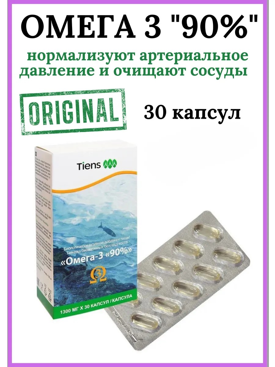Важным фактором поддержания здоровья сердца являются полиненасыщенные жирные кислоты Омега-3, дополнительным источником которых являются капсулы «Омега-3 90%». Жиры, полученные при переработке морской рыбы, используются для профилактики множества заболеваний.Полиненасыщенные жирные кислоты Омега-3 — собирательное название нескольких жирных кислот, которые не синтезируются в нужных количествах в организме человека, однако необходимы для поддержания здоровья сердечной мышцы, сосудов, нервной, пищеварительной и иммунной системы. Содержащиеся в капсулах «Омега-3 90%» ПНЖК, в том числе докозагексаеновая и эйкозапентаеновая кислоты, принимают активное участие в обмене веществ, являются строительным материалом клеток, способствуют повышению эластичности сосудов, нормализации холестеринового обмена, улучшению вязкости крови.Для производства «Омега-3 90%» используется высококачественное сырье из северных пород рыб, которое проходит многоступенчатую очистку и дополнительную концентрацию Омега-3 кислот до 90%.Согласно научным исследованиям, Омега-3 полиненасыщенные жирные кислоты:\- снижают риск развития атеросклероза\, инсульта\, инфаркта миокарда\, тромбоза\, полезны в восстановительный период после сердечного приступа;\- нормализуют артериальное давление и очищают сосуды\, задерживая образование холестериновых бляшек;\- регулируют липидный баланс организма;\- важны для поддержания нормального функционирования нервной системы и зрения;\- поддерживают концентрацию серотонина в организме\, подавляют выработку гормонов стресса и не позволяют развиваться депрессивным состояниям;\- улучшают энергетический обмен в клетках и обеспечивают снижение воспалительных процессов\.Одна капсула «Омега-3 90%» обеспечивает оптимальную суточную потребность.При употреблении БАД в рекомендованном количестве в организм будут поступать:**Рекомендации по применению:** взрослым и детям старше 14 лет по 1 капсуле 1 раз в день во время еды. Продолжительность приема 1 месяц. Возможны повторные приемы в течение года.**Противопоказания:** индивидуальная непереносимость компонентов продукта, беременность, кормление грудью. Перед применением необходимо проконсультироваться с врачом.**Состав:** рыбий жир, оболочка (желатин, глицерин (пластификатор), вода), смесь токоферолов (антиокислитель).**Форма выпуска:** капсулы массой 1300 мг. В упаковке 30 капсул в блистерах и картонном пенале, защищающем от солнечного света.**Условия хранения:** хранить в сухом, защищенном от прямых солнечных лучей и недоступном для детей месте при температуре не выше 25°С.