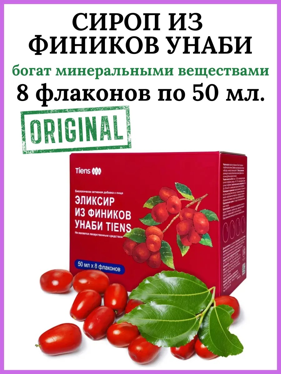 Сырье для производства - отборные, экологически чистые финики унаби. Применение современных технологий обеспечивает высокую чистоту продукта и содержание циклического аденозинмонофосфата ?45 мг/кг. Выпускается в форме сиропа высокой концентрации, легко усваивается организмом. По содержанию циклического нуклеотида плоды китайского финика занимают первое место среди других видов лекарственного сырья. Кроме того, в нем содержатся сахариды (60-70%) и витамин С (в 60-80 раз больше, чем в яблоках). Предназначен для людей, страдающих анемией, бессонницей, с пониженным иммунитетом. Способ употребления: В зависимости от личных предпочтений разбавить водой комнатной температуры, размешать. Рекомендуется употребить в течение 2 дней с момента вскрытия упаковки. Возможно образование естественного осадка, перед употреблением взболтать. Противопоказания: индивидуальная непереносимость компонентов продукта, сахарный диабет. Детям принимать данный продукт не рекомендуется.