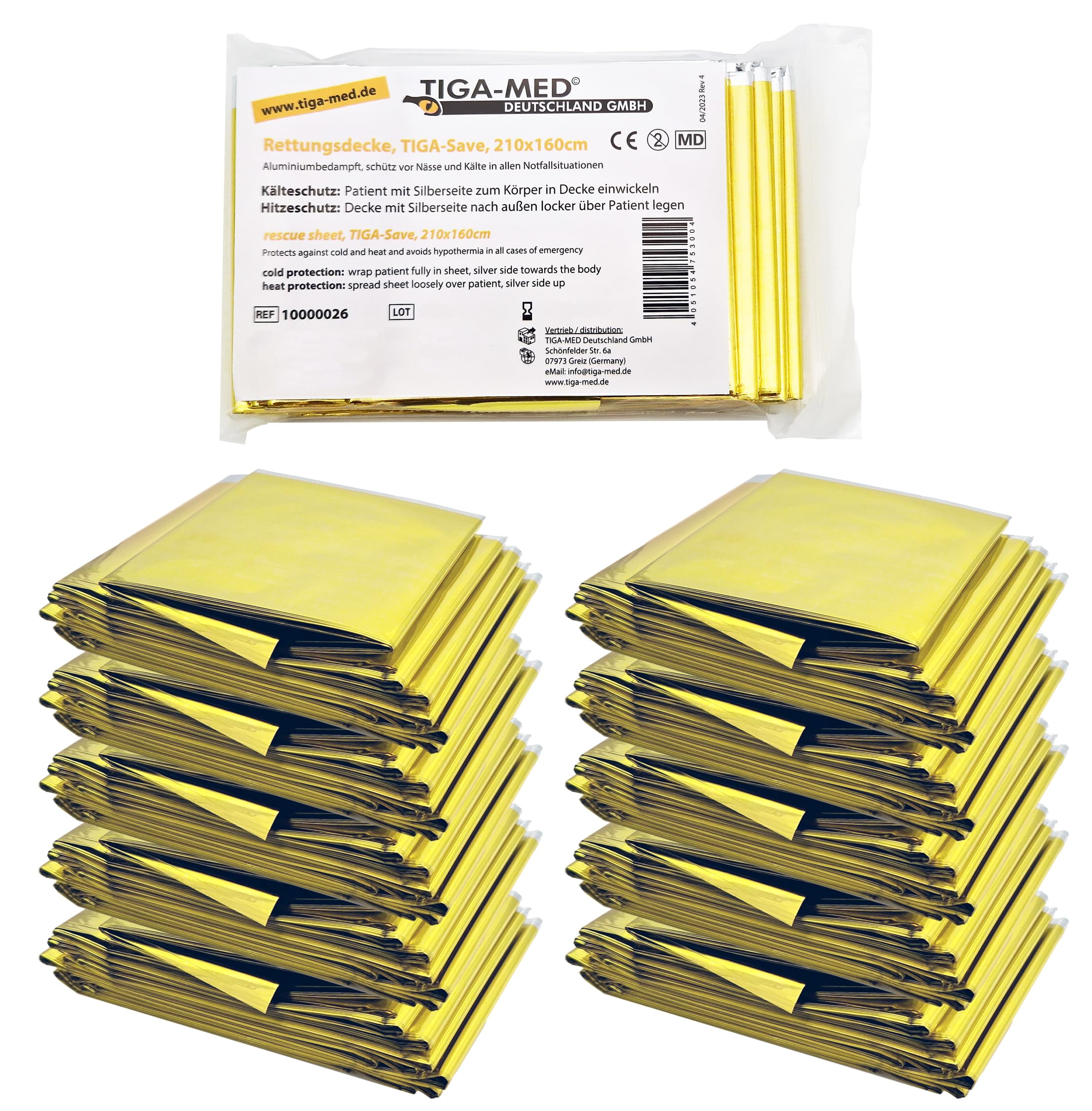 Tiga-Med Rettungsdecke Rettungsdecken 50er Set (= 50 Stück) Gold/Silber 210x160cm Rettungsfolie für Erste Hilfe Notfall Rettungsdienst