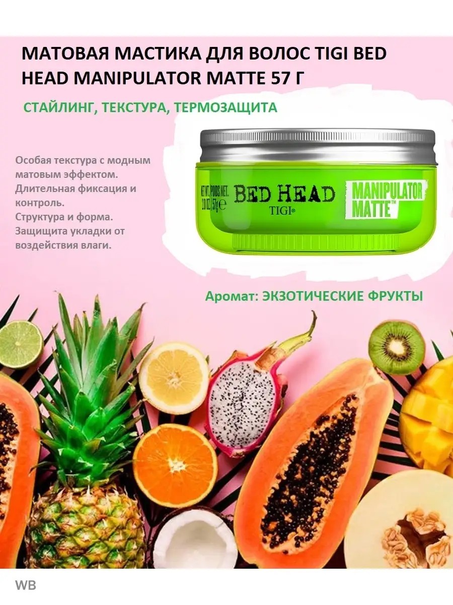 TIGI Bed Head ST Manipulator Matte** is a hair mastic with natural beeswax. Hold: super-strong. It gives your hair a subtle matte finish, preventing shine for a natural, fresh look. Beeswax ensures long-lasting hold. Suitable for short to medium-length hair. Directions: Before applying, rub the mastic between your hands and distribute through your hair. Can be used on dry or damp, clean hair. Style with a hairdryer, hands, or additional heat tools. Ingredients: WATER (AQUA/EAU), BEESWAX (CERA ALBA/CIRE D'ABEILLE), BIS-DIGLYCERYLPOLYACYLADIPATE-2, VASELINE, CETEARYL ALCOHOL, PROPYLENE GLYCOL, VP/VA COPOLYMER, COPERNICIA CERIFERA (CARNAUBA) WAX (CERA CARNAUBA/CIRE DE CARNAUBA), DIETHYLHEXYLADIPATE, OZOKERITE, VINYLCAPROLACTAM/VP/DIMETHYLAMINOETHYL METHACRYLATE COPOLYMER, PEG-40 HYDROGENATED CASTOR OIL, PHENOXYETHANOL, CAPRYLYL GLYCOL, FRAGRANCE (Eau de Parfum), Glycerin, Disodium EDTA, Citric Acid, PEG-90M, ISOPROPYL ALCOHOL, LAURTRIMONIUM CHLORIDE, SILICON DIOXIDE, PPG-3 BENZYL ETHER MYRISTE, ORBIGNIA OLEIFERA SEED OIL, BENZYL BENZOATE, BENZYL SALICYLATE, COUMARIN, LIMONENE, GREEN 3 (CI 42053), ORANGE 4 (CI 15510), YELLOW 5 (CI 19140).